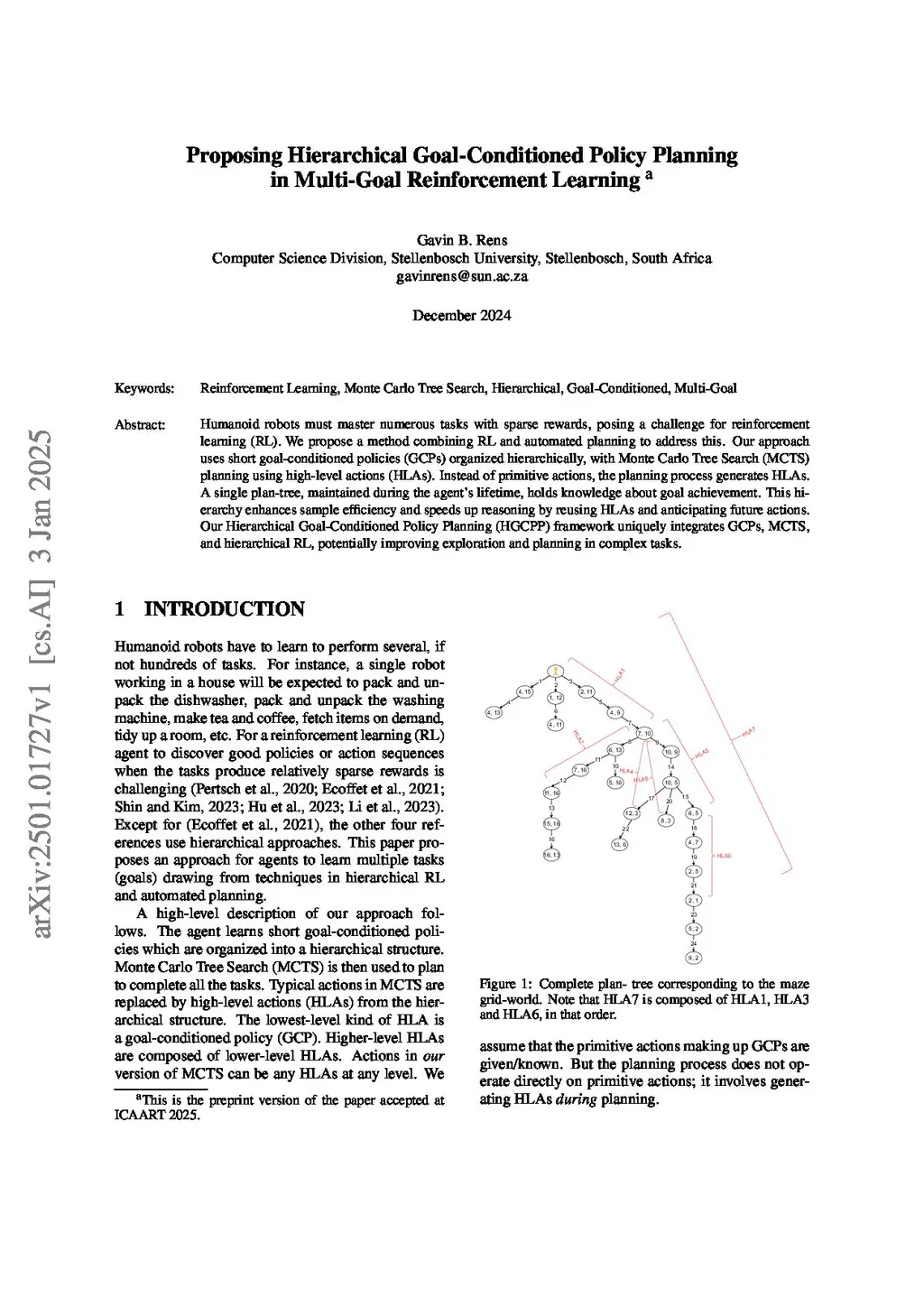 Humanoid robots must master numerous tasks with sparse rewards, posing a challenge for reinforcement learning (RL). We propose a method combining RL and automated planning to address this. Our approach uses short goal-conditioned policies (GCPs) organized hierarchically, with Monte Carlo Tree Search (MCTS) planning using high-level actions (HLAs). Instead of primitive actions, the planning process generates HLAs. A single plan-tree, maintained during the agent's lifetime, holds knowledge about goal achievement. This hierarchy enhances sample efficiency and speeds up reasoning by reusing HLAs and anticipating future actions. Our Hierarchical Goal-Conditioned Policy Planning (HGCPP) framework uniquely integrates GCPs, MCTS, and hierarchical RL, potentially improving exploration and planning in complex tasks.