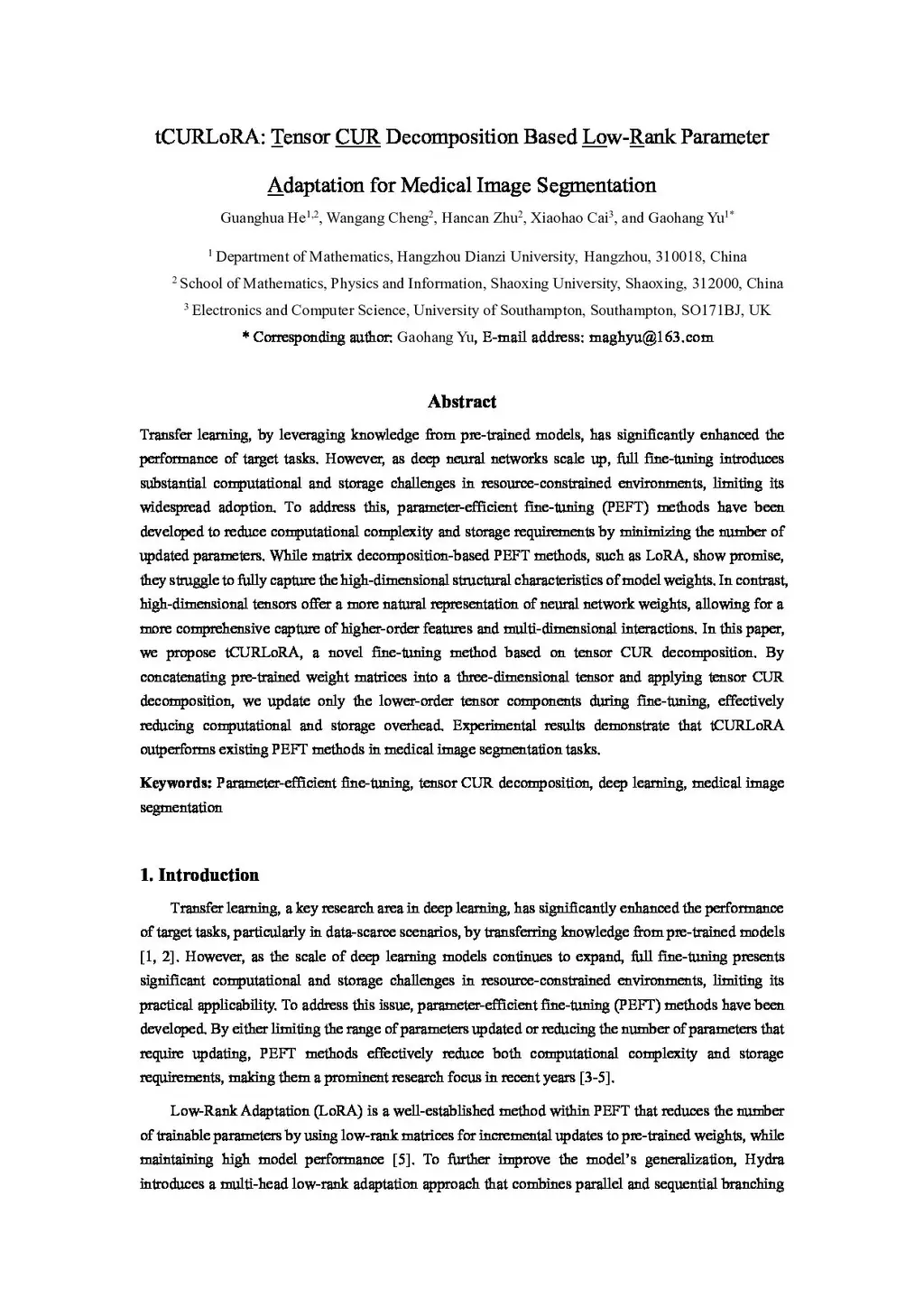 Transfer learning, by leveraging knowledge from pre-trained models, has significantly enhanced the performance of target tasks. However, as deep neural networks scale up, full fine-tuning introduces substantial computational and storage challenges in resource-constrained environments, limiting its widespread adoption. To address this, parameter-efficient fine-tuning (PEFT) methods have been developed to reduce computational complexity and storage requirements by minimizing the number of updated parameters. While matrix decomposition-based PEFT methods, such as LoRA, show promise, they struggle to fully capture the high-dimensional structural characteristics of model weights. In contrast, high-dimensional tensors offer a more natural representation of neural network weights, allowing for a more comprehensive capture of higher-order features and multi-dimensional interactions. In this paper, we propose tCURLoRA, a novel fine-tuning method based on tensor CUR decomposition. By concatenating pre-trained weight matrices into a three-dimensional tensor and applying tensor CUR decomposition, we update only the lower-order tensor components during fine-tuning, effectively reducing computational and storage overhead. Experimental results demonstrate that tCURLoRA outperforms existing PEFT methods in medical image segmentation tasks.