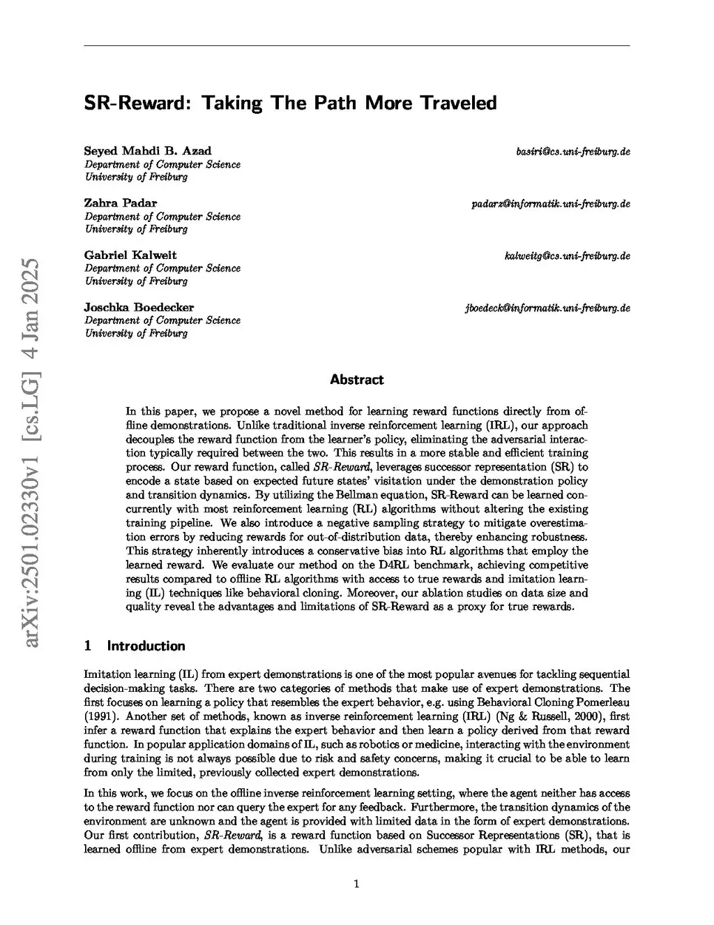 In this paper, we propose a novel method for learning reward functions directly from offline demonstrations. Unlike traditional inverse reinforcement learning (IRL), our approach decouples the reward function from the learner's policy, eliminating the adversarial interaction typically required between the two. This results in a more stable and efficient training process. Our reward function, called \textit{SR-Reward}, leverages successor representation (SR) to encode a state based on expected future states' visitation under the demonstration policy and transition dynamics. By utilizing the Bellman equation, SR-Reward can be learned concurrently with most reinforcement learning (RL) algorithms without altering the existing training pipeline. We also introduce a negative sampling strategy to mitigate overestimation errors by reducing rewards for out-of-distribution data, thereby enhancing robustness. This strategy inherently introduces a conservative bias into RL algorithms that employ the learned reward. We evaluate our method on the D4RL benchmark, achieving competitive results compared to offline RL algorithms with access to true rewards and imitation learning (IL) techniques like behavioral cloning. Moreover, our ablation studies on data size and quality reveal the advantages and limitations of SR-Reward as a proxy for true rewards.