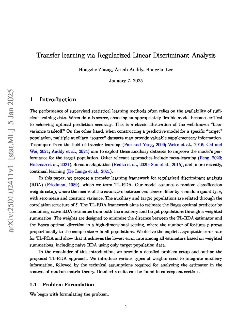 Transfer learning via Regularized Linear Discriminant Analysis