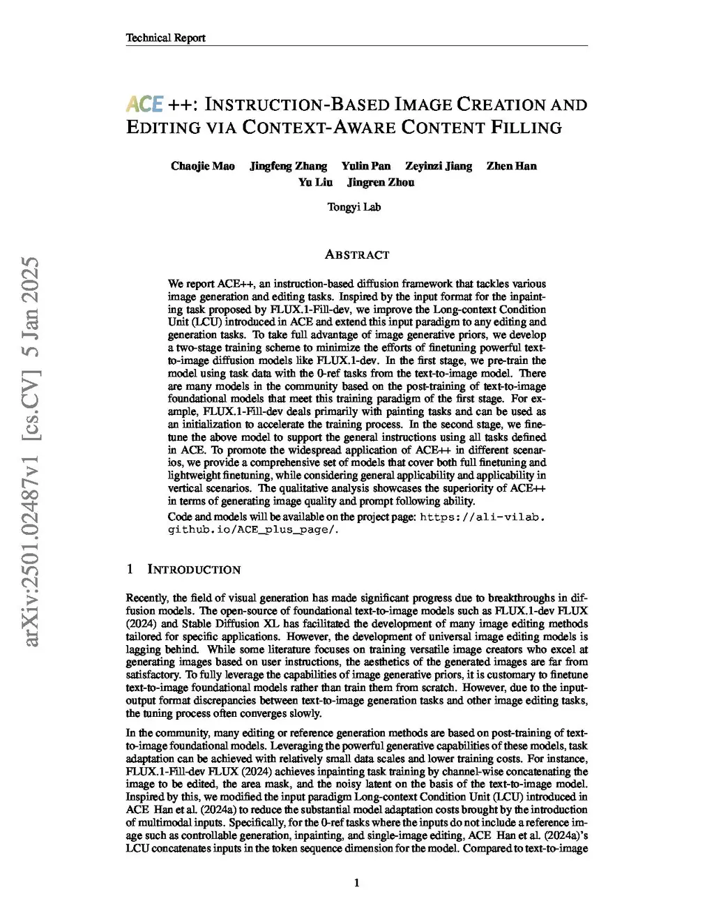 We report ACE++, an instruction-based diffusion framework that tackles various image generation and editing tasks. Inspired by the input format for the inpainting task proposed by FLUX.1-Fill-dev, we improve the Long-context Condition Unit (LCU) introduced in ACE and extend this input paradigm to any editing and generation tasks. To take full advantage of image generative priors, we develop a two-stage training scheme to minimize the efforts of finetuning powerful text-to-image diffusion models like FLUX.1-dev. In the first stage, we pre-train the model using task data with the 0-ref tasks from the text-to-image model. There are many models in the community based on the post-training of text-to-image foundational models that meet this training paradigm of the first stage. For example, FLUX.1-Fill-dev deals primarily with painting tasks and can be used as an initialization to accelerate the training process. In the second stage, we finetune the above model to support the general instructions using all tasks defined in ACE. To promote the widespread application of ACE++ in different scenarios, we provide a comprehensive set of models that cover both full finetuning and lightweight finetuning, while considering general applicability and applicability in vertical scenarios. The qualitative analysis showcases the superiority of ACE++ in terms of generating image quality and prompt following ability. Code and models will be available on the project page: https://ali-vilab.this http URL.