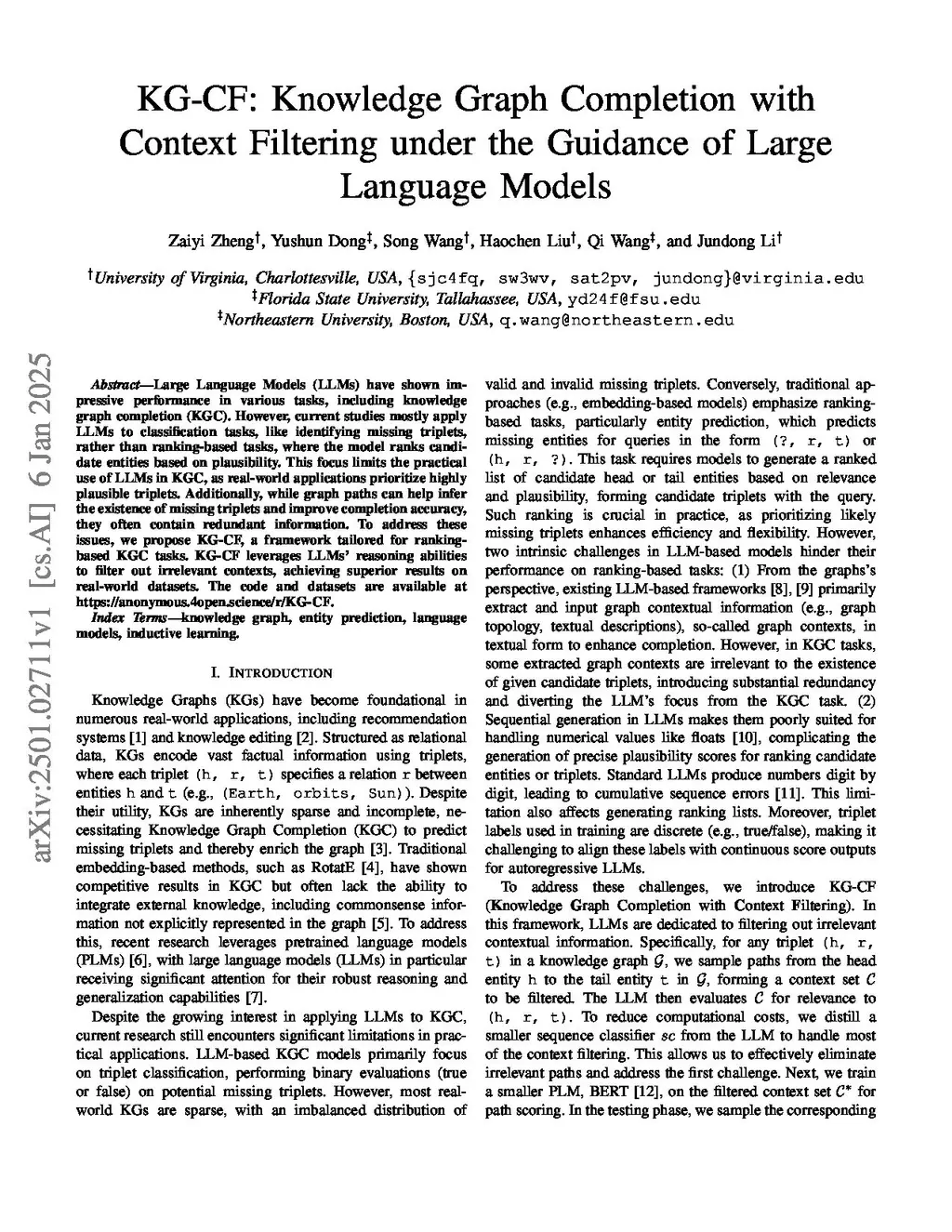 Large Language Models (LLMs) have shown impressive performance in various tasks, including knowledge graph completion (KGC). However, current studies mostly apply LLMs to classification tasks, like identifying missing triplets, rather than ranking-based tasks, where the model ranks candidate entities based on plausibility. This focus limits the practical use of LLMs in KGC, as real-world applications prioritize highly plausible triplets. Additionally, while graph paths can help infer the existence of missing triplets and improve completion accuracy, they often contain redundant information. To address these issues, we propose KG-CF, a framework tailored for ranking-based KGC tasks. KG-CF leverages LLMs' reasoning abilities to filter out irrelevant contexts, achieving superior results on real-world datasets. The code and datasets are available at \url{this https URL}.