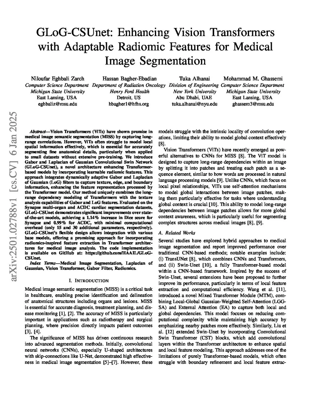 GLoG-CSUnet: Enhancing Vision Transformers with Adaptable Radiomic Features for Medical Image Segmentation