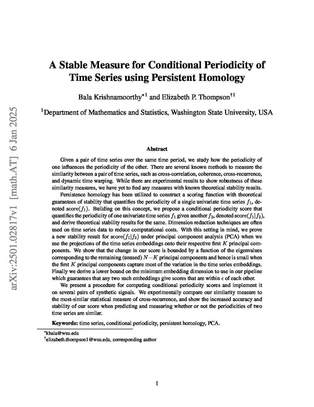 Given a pair of time series, we study how the periodicity of one influences the periodicity of the other. There are several known methods to measure the similarity between a pair of time series, such as cross-correlation, coherence, cross-recurrence, and dynamic time warping. But we have yet to find any measures with theoretical stability results.Persistence homology has been utilized to construct a scoring function with theoretical guarantees of stability that quantifies the periodicity of a single univariate time series f1, denoted score(f1). Building on this concept, we propose a conditional periodicity score that quantifies the periodicity of one univariate time series f1 given another f2, denoted score(f1|f2), and derive theoretical stability results for the same. With the use of dimension reduction in mind, we prove a new stability result for score(f1|f2) under principal component analysis (PCA) when we use the projections of the time series embeddings onto their respective first K principal components. We show that the change in our score is bounded by a function of the eigenvalues corresponding to the remaining (unused) N-K principal components and hence is small when the first K principal components capture most of the variation in the time series embeddings. Finally we derive a lower bound on the minimum embedding dimension to use in our pipeline which guarantees that any two such embeddings give scores that are within a given epsilon of each other.We present a procedure for computing conditional periodicity scores and implement it on several pairs of synthetic signals. We experimentally compare our similarity measure to the most-similar statistical measure of cross-recurrence, and show the increased accuracy and stability of our score when predicting and measuring whether or not the periodicities of two time series are similar.