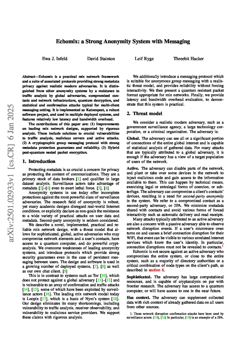 Echomix is a practical mix network framework and a suite of associated protocols providing strong metadata privacy against realistic modern adversaries. It is distinguished from other anonymity systems by a resistance to traffic analysis by global adversaries, compromised contacts and network infrastructure, quantum decryption algorithms, and statistical and confirmation attacks typical for multi-client messaging setting. It is implemented as Katzenpost, a robust software project, and used in multiple deployed systems, and features relatively low latency and bandwidth overhead. The contributions of this paper are: (1) Improvements on leading mix network designs, supported by rigorous analysis. These include solutions to crucial vulnerabilities to traffic analysis, malicious servers and active attacks. (2) A cryptographic group messaging protocol with strong metadata protection guarantees and reliability. (3) Hybrid post-quantum nested packet encryption.