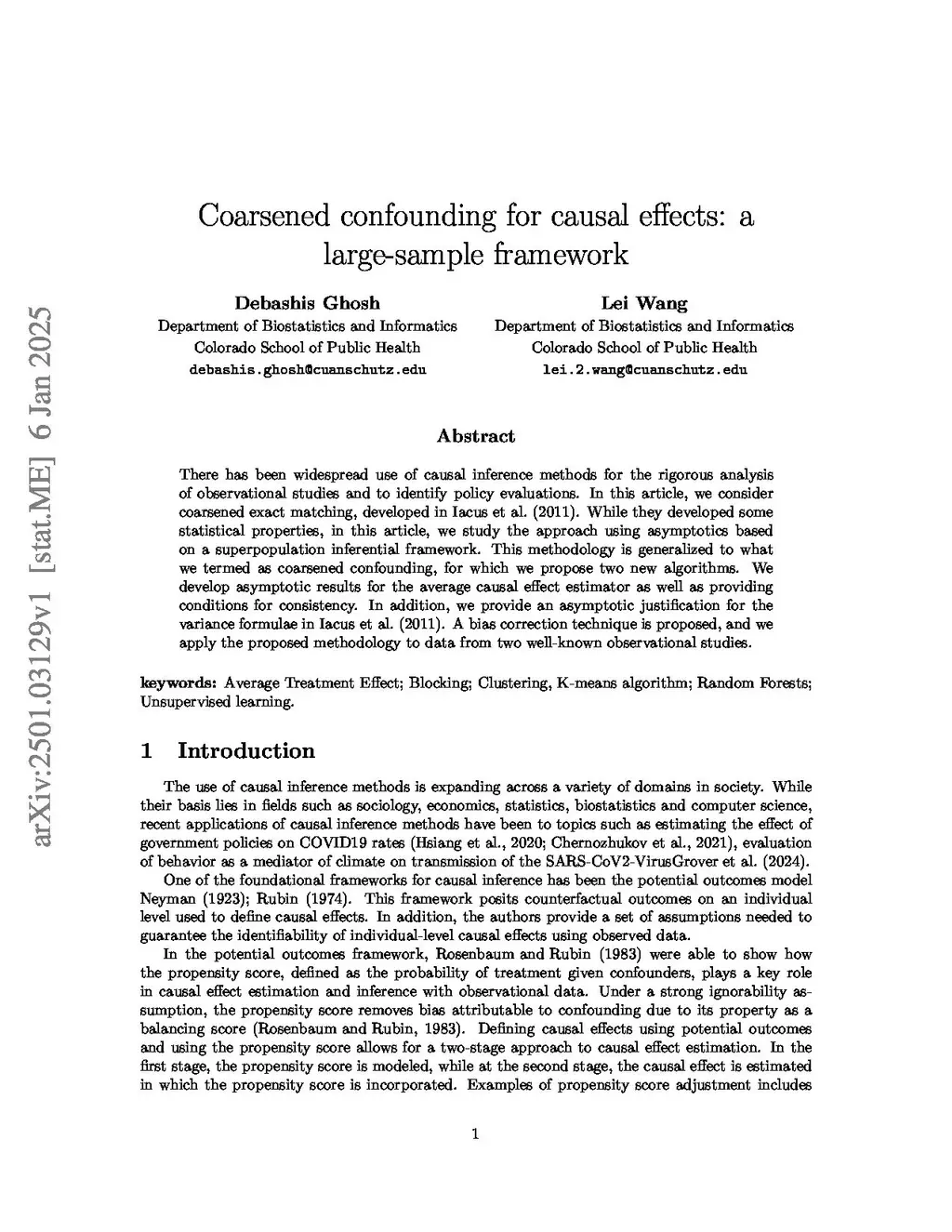 There has been widespread use of causal inference methods for the rigorous analysis of observational studies and to identify policy evaluations. In this article, we consider a class of generalized coarsened procedures for confounding. At a high level, these procedures can be viewed as performing a clustering of confounding variables, followed by treatment effect and attendant variance estimation using the confounder strata. In addition, we propose two new algorithms for generalized coarsened confounding. While Iacus et al. (2011) developed some statistical properties for one special case in our class of procedures, we instead develop a general asymptotic framework. We provide asymptotic results for the average causal effect estimator as well as providing conditions for consistency. In addition, we provide an asymptotic justification for the variance formulae in Iacus et al. (2011). A bias correction technique is proposed, and we apply the proposed methodology to data from two well-known observational studies.