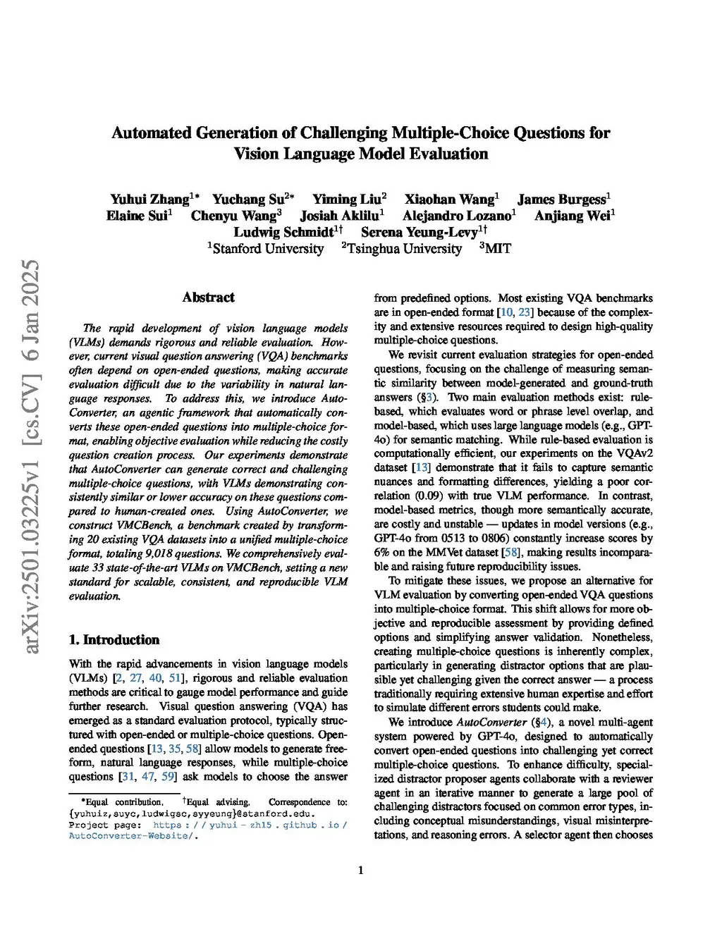 The rapid development of vision language models (VLMs) demands rigorous and reliable evaluation. However, current visual question answering (VQA) benchmarks often depend on open-ended questions, making accurate evaluation difficult due to the variability in natural language responses. To address this, we introduce AutoConverter, an agentic framework that automatically converts these open-ended questions into multiple-choice format, enabling objective evaluation while reducing the costly multiple-choice question creation process. Our experiments demonstrate that AutoConverter can generate correct and challenging multiple-choice questions, with VLMs demonstrating consistently similar or lower accuracy on these questions compared to human-created ones. Using AutoConverter, we construct VMCBench, a benchmark created by transforming 20 existing VQA datasets into a unified multiple-choice format, totaling 9,018 questions. We comprehensively evaluate 33 state-of-the-art VLMs on VMCBench, setting a new standard for scalable, consistent, and reproducible VLM evaluation.