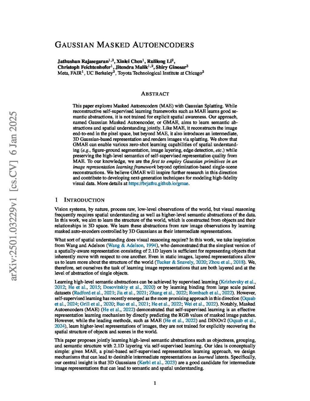 This paper explores Masked Autoencoders (MAE) with Gaussian Splatting. While reconstructive self-supervised learning frameworks such as MAE learns good semantic abstractions, it is not trained for explicit spatial awareness. Our approach, named Gaussian Masked Autoencoder, or GMAE, aims to learn semantic abstractions and spatial understanding jointly. Like MAE, it reconstructs the image end-to-end in the pixel space, but beyond MAE, it also introduces an intermediate, 3D Gaussian-based representation and renders images via splatting. We show that GMAE can enable various zero-shot learning capabilities of spatial understanding (e.g., figure-ground segmentation, image layering, edge detection, etc.) while preserving the high-level semantics of self-supervised representation quality from MAE. To our knowledge, we are the first to employ Gaussian primitives in an image representation learning framework beyond optimization-based single-scene reconstructions. We believe GMAE will inspire further research in this direction and contribute to developing next-generation techniques for modeling high-fidelity visual data. More details atthis https URL