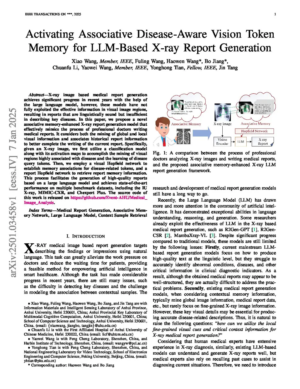 Activating Associative Disease-Aware Vision Token Memory for LLM-Based X-ray Report Generation