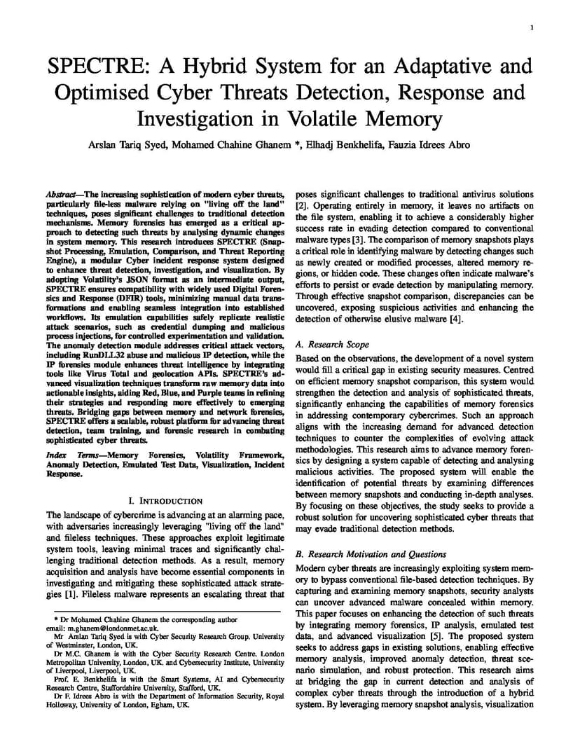 The increasing sophistication of modern cyber threats, particularly file-less malware relying on living-off-the-land techniques, poses significant challenges to traditional detection mechanisms. Memory forensics has emerged as a crucial method for uncovering such threats by analysing dynamic changes in memory. This research introduces SPECTRE (Snapshot Processing, Emulation, Comparison, and Threat Reporting Engine), a modular Cyber Incident Response System designed to enhance threat detection, investigation, and visualization. By adopting Volatility JSON format as an intermediate output, SPECTRE ensures compatibility with widely used DFIR tools, minimizing manual data transformations and enabling seamless integration into established workflows. Its emulation capabilities safely replicate realistic attack scenarios, such as credential dumping and malicious process injections, for controlled experimentation and validation. The anomaly detection module addresses critical attack vectors, including RunDLL32 abuse and malicious IP detection, while the IP forensics module enhances threat intelligence by integrating tools like Virus Total and geolocation APIs. SPECTRE advanced visualization techniques transform raw memory data into actionable insights, aiding Red, Blue and Purple teams in refining strategies and responding effectively to threats. Bridging gaps between memory and network forensics, SPECTRE offers a scalable, robust platform for advancing threat detection, team training, and forensic research in combating sophisticated cyber threats.