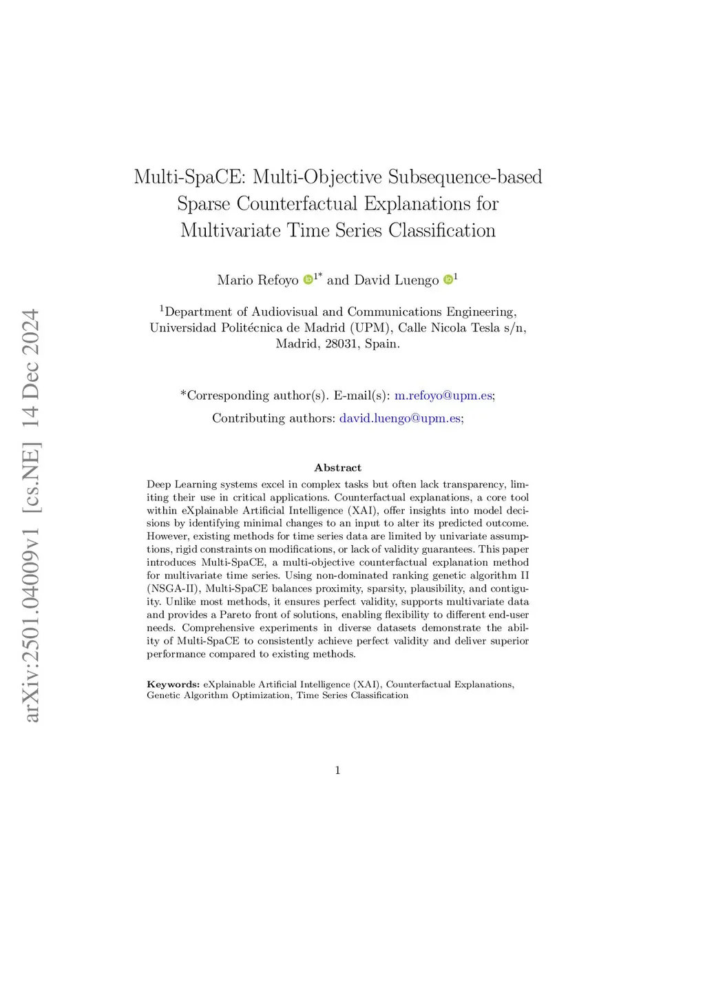 Deep Learning systems excel in complex tasks but often lack transparency, limiting their use in critical applications. Counterfactual explanations, a core tool within eXplainable Artificial Intelligence (XAI), offer insights into model decisions by identifying minimal changes to an input to alter its predicted outcome. However, existing methods for time series data are limited by univariate assumptions, rigid constraints on modifications, or lack of validity guarantees. This paper introduces Multi-SpaCE, a multi-objective counterfactual explanation method for multivariate time series. Using non-dominated ranking genetic algorithm II (NSGA-II), Multi-SpaCE balances proximity, sparsity, plausibility, and contiguity. Unlike most methods, it ensures perfect validity, supports multivariate data and provides a Pareto front of solutions, enabling flexibility to different end-user needs. Comprehensive experiments in diverse datasets demonstrate the ability of Multi-SpaCE to consistently achieve perfect validity and deliver superior performance compared to existing methods.