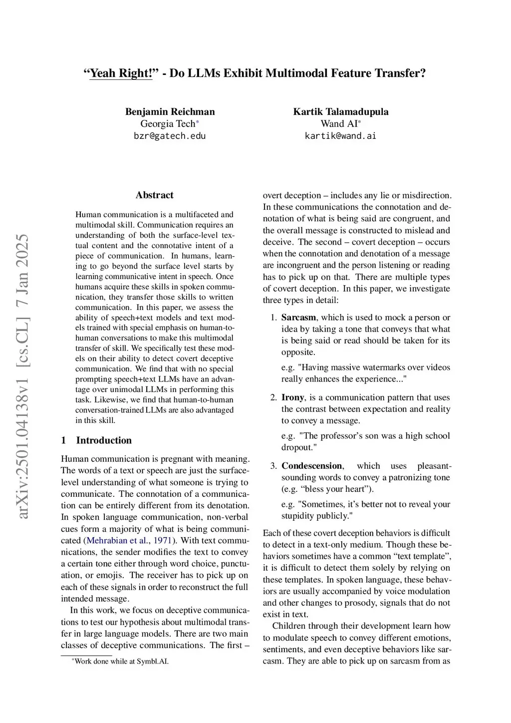 Human communication is a multifaceted and multimodal skill. Communication requires an understanding of both the surface-level textual content and the connotative intent of a piece of communication. In humans, learning to go beyond the surface level starts by learning communicative intent in speech. Once humans acquire these skills in spoken communication, they transfer those skills to written communication. In this paper, we assess the ability of speech+text models and text models trained with special emphasis on human-to-human conversations to make this multimodal transfer of skill. We specifically test these models on their ability to detect covert deceptive communication. We find that with no special prompting speech+text LLMs have an advantage over unimodal LLMs in performing this task. Likewise, we find that human-to-human conversation-trained LLMs are also advantaged in this skill.