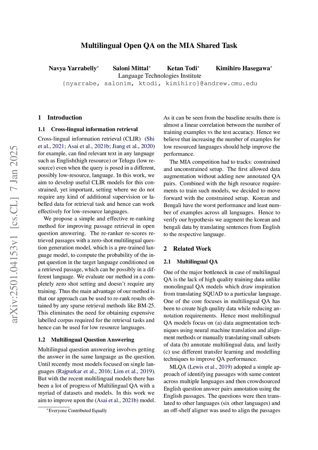 Cross-lingual information retrieval (CLIR) ~\cite{shi2021cross, asai2021one, jiang2020cross} for example, can find relevant text in any language such as English(high resource) or Telugu (low resource) even when the query is posed in a different, possibly low-resource, language. In this work, we aim to develop useful CLIR models for this constrained, yet important, setting where we do not require any kind of additional supervision or labelled data for retrieval task and hence can work effectively for low-resource languages.\par We propose a simple and effective re-ranking method for improving passage retrieval in open question answering. The re-ranker re-scores retrieved passages with a zero-shot multilingual question generation model, which is a pre-trained language model, to compute the probability of the input question in the target language conditioned on a retrieved passage, which can be possibly in a different language. We evaluate our method in a completely zero shot setting and doesn't require any training. Thus the main advantage of our method is that our approach can be used to re-rank results obtained by any sparse retrieval methods like BM-25. This eliminates the need for obtaining expensive labelled corpus required for the retrieval tasks and hence can be used for low resource languages.