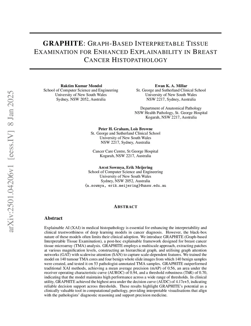 Explainable AI (XAI) in medical histopathology is essential for enhancing the interpretability and clinical trustworthiness of deep learning models in cancer diagnosis. However, the black-box nature of these models often limits their clinical adoption. We introduce GRAPHITE (Graph-based Interpretable Tissue Examination), a post-hoc explainable framework designed for breast cancer tissue microarray (TMA) analysis. GRAPHITE employs a multiscale approach, extracting patches at various magnification levels, constructing an hierarchical graph, and utilising graph attention networks (GAT) with scalewise attention (SAN) to capture scale-dependent features. We trained the model on 140 tumour TMA cores and four benign whole slide images from which 140 benign samples were created, and tested it on 53 pathologist-annotated TMA samples. GRAPHITE outperformed traditional XAI methods, achieving a mean average precision (mAP) of 0.56, an area under the receiver operating characteristic curve (AUROC) of 0.94, and a threshold robustness (ThR) of 0.70, indicating that the model maintains high performance across a wide range of thresholds. In clinical utility, GRAPHITE achieved the highest area under the decision curve (AUDC) of 4.17e+5, indicating reliable decision support across thresholds. These results highlight GRAPHITE's potential as a clinically valuable tool in computational pathology, providing interpretable visualisations that align with the pathologists' diagnostic reasoning and support precision medicine.