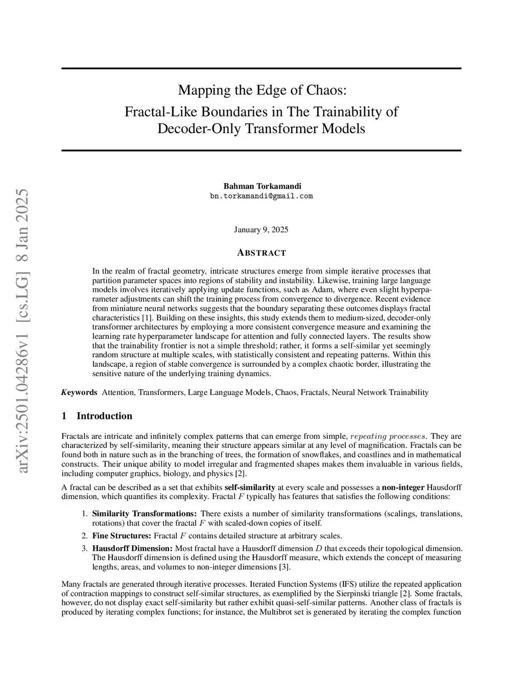 In the realm of fractal geometry, intricate structures emerge from simple iterative processes that partition parameter spaces into regions of stability and instability. Likewise, training large language models involves iteratively applying update functions, such as Adam, where even slight hyperparameter adjustments can shift the training process from convergence to divergence. Recent evidence from miniature neural networks suggests that the boundary separating these outcomes displays fractal characteristics. Building on these insights, this study extends them to medium-sized, decoder-only transformer architectures by employing a more consistent convergence measure and examining the learning rate hyperparameter landscape for attention and fully connected layers. The results show that the trainability frontier is not a simple threshold; rather, it forms a self-similar yet seemingly random structure at multiple scales, with statistically consistent and repeating patterns. Within this landscape, a region of stable convergence is surrounded by a complex chaotic border, illustrating the sensitive nature of the underlying training dynamics.