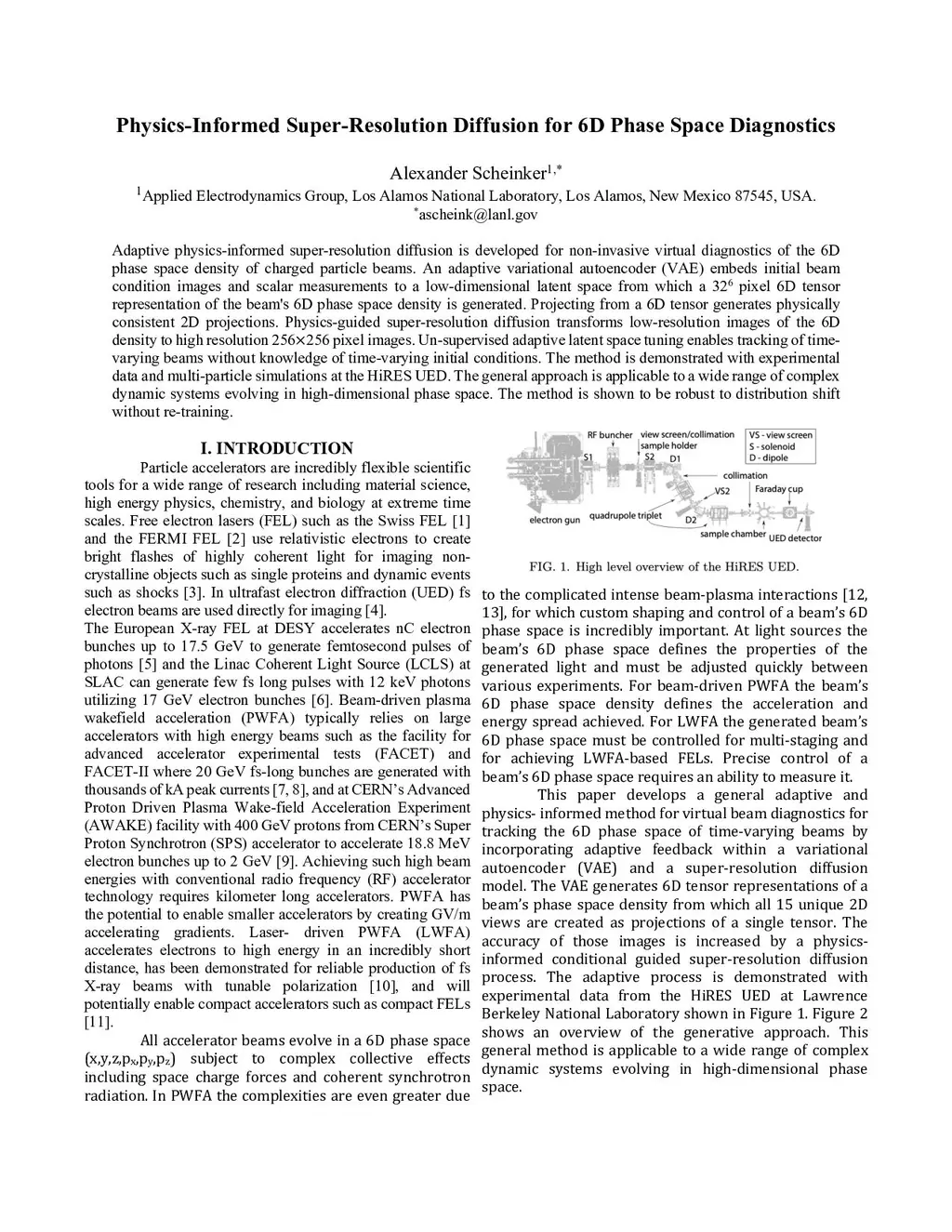 Adaptive physics-informed super-resolution diffusion is developed for non-invasive virtual diagnostics of the 6D phase space density of charged particle beams. An adaptive variational autoencoder (VAE) embeds initial beam condition images and scalar measurements to a low-dimensional latent space from which a 326 pixel 6D tensor representation of the beam's 6D phase space density is generated. Projecting from a 6D tensor generates physically consistent 2D projections. Physics-guided super-resolution diffusion transforms low-resolution images of the 6D density to high resolution 256x256 pixel images. Un-supervised adaptive latent space tuning enables tracking of time-varying beams without knowledge of time-varying initial conditions. The method is demonstrated with experimental data and multi-particle simulations at the HiRES UED. The general approach is applicable to a wide range of complex dynamic systems evolving in high-dimensional phase space. The method is shown to be robust to distribution shift without re-training.
