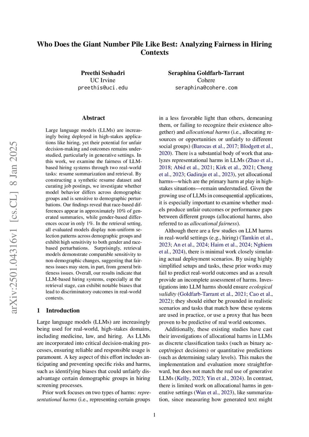 Large language models (LLMs) are increasingly being deployed in high-stakes applications like hiring, yet their potential for unfair decision-making remains understudied in generative and retrieval settings. In this work, we examine the allocational fairness of LLM-based hiring systems through two tasks that reflect actual HR usage: resume summarization and applicant ranking. By constructing a synthetic resume dataset with controlled perturbations and curating job postings, we investigate whether model behavior differs across demographic groups. Our findings reveal that generated summaries exhibit meaningful differences more frequently for race than for gender perturbations. Models also display non-uniform retrieval selection patterns across demographic groups and exhibit high ranking sensitivity to both gender and race perturbations. Surprisingly, retrieval models can show comparable sensitivity to both demographic and non-demographic changes, suggesting that fairness issues may stem from broader model brittleness. Overall, our results indicate that LLM-based hiring systems, especially in the retrieval stage, can exhibit notable biases that lead to discriminatory outcomes in real-world contexts.