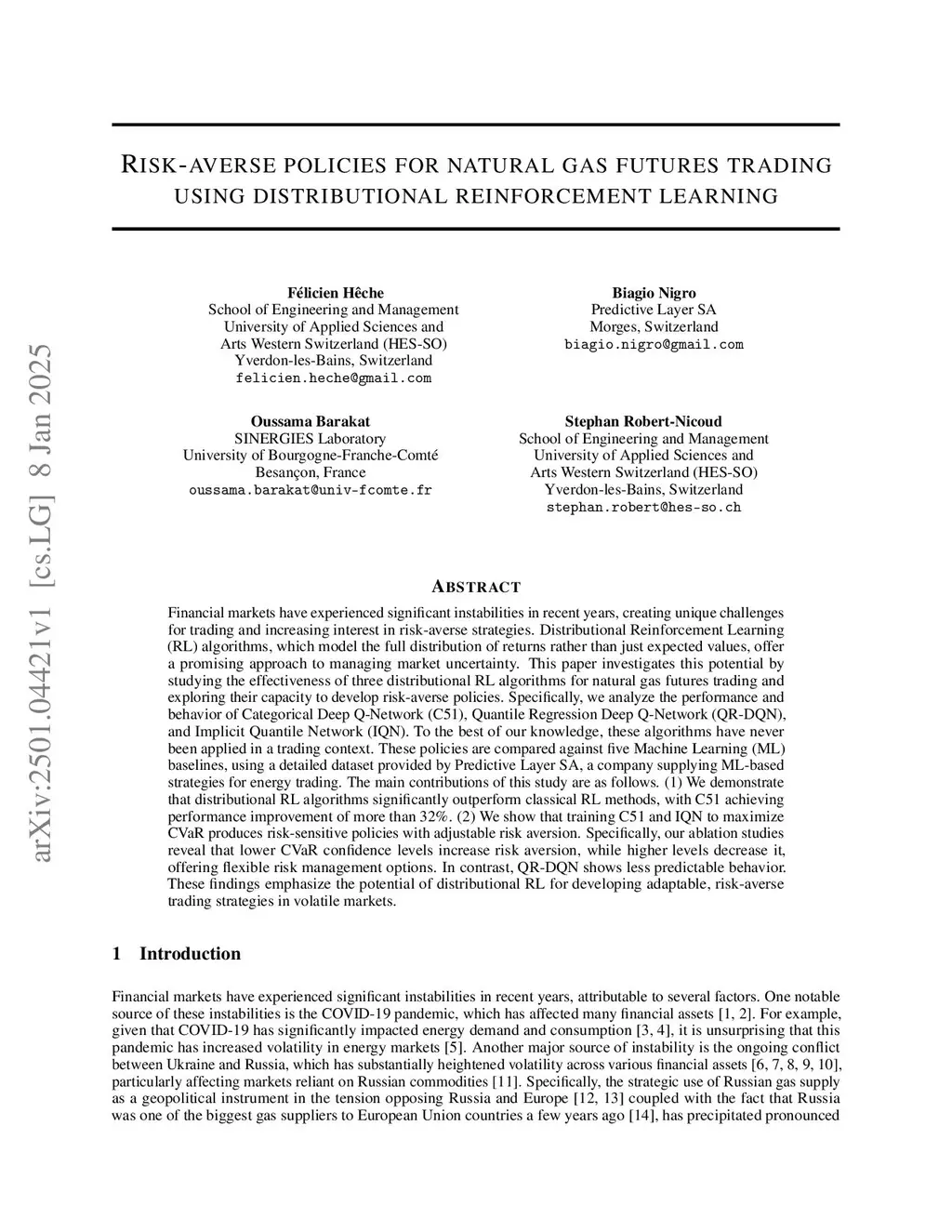Financial markets have experienced significant instabilities in recent years, creating unique challenges for trading and increasing interest in risk-averse strategies. Distributional Reinforcement Learning (RL) algorithms, which model the full distribution of returns rather than just expected values, offer a promising approach to managing market uncertainty. This paper investigates this potential by studying the effectiveness of three distributional RL algorithms for natural gas futures trading and exploring their capacity to develop risk-averse policies. Specifically, we analyze the performance and behavior of Categorical Deep Q-Network (C51), Quantile Regression Deep Q-Network (QR-DQN), and Implicit Quantile Network (IQN). To the best of our knowledge, these algorithms have never been applied in a trading context. These policies are compared against five Machine Learning (ML) baselines, using a detailed dataset provided by Predictive Layer SA, a company supplying ML-based strategies for energy trading. The main contributions of this study are as follows. (1) We demonstrate that distributional RL algorithms significantly outperform classical RL methods, with C51 achieving performance improvement of more than 32\%. (2) We show that training C51 and IQN to maximize CVaR produces risk-sensitive policies with adjustable risk aversion. Specifically, our ablation studies reveal that lower CVaR confidence levels increase risk aversion, while higher levels decrease it, offering flexible risk management options. In contrast, QR-DQN shows less predictable behavior. These findings emphasize the potential of distributional RL for developing adaptable, risk-averse trading strategies in volatile markets.