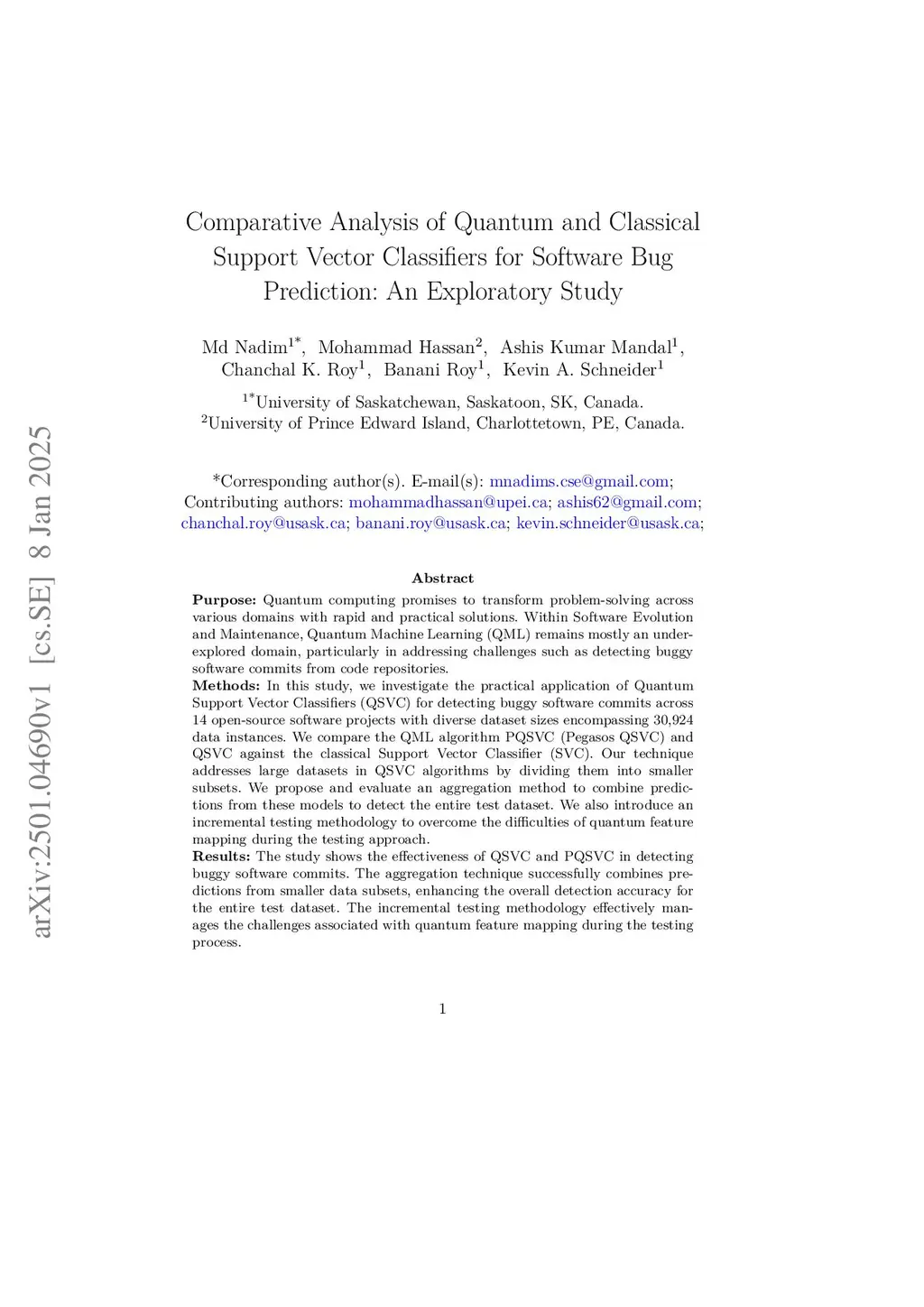 Purpose: Quantum computing promises to transform problem-solving across various domains with rapid and practical solutions. Within Software Evolution and Maintenance, Quantum Machine Learning (QML) remains mostly an underexplored domain, particularly in addressing challenges such as detecting buggy software commits from code repositories. Methods: In this study, we investigate the practical application of Quantum Support Vector Classifiers (QSVC) for detecting buggy software commits across 14 open-source software projects with diverse dataset sizes encompassing 30,924 data instances. We compare the QML algorithm PQSVC (Pegasos QSVC) and QSVC against the classical Support Vector Classifier (SVC). Our technique addresses large datasets in QSVC algorithms by dividing them into smaller subsets. We propose and evaluate an aggregation method to combine predictions from these models to detect the entire test dataset. We also introduce an incremental testing methodology to overcome the difficulties of quantum feature mapping during the testing approach. Results: The study shows the effectiveness of QSVC and PQSVC in detecting buggy software commits. The aggregation technique successfully combines predictions from smaller data subsets, enhancing the overall detection accuracy for the entire test dataset. The incremental testing methodology effectively manages the challenges associated with quantum feature mapping during the testing process. Conclusion: We contribute to the advancement of QML algorithms in defect prediction, unveiling the potential for further research in this domain. The specific scenario of the Short-Term Activity Frame (STAF) highlights the early detection of buggy software commits during the initial developmental phases of software systems, particularly when dataset sizes remain insufficient to train machine learning models.