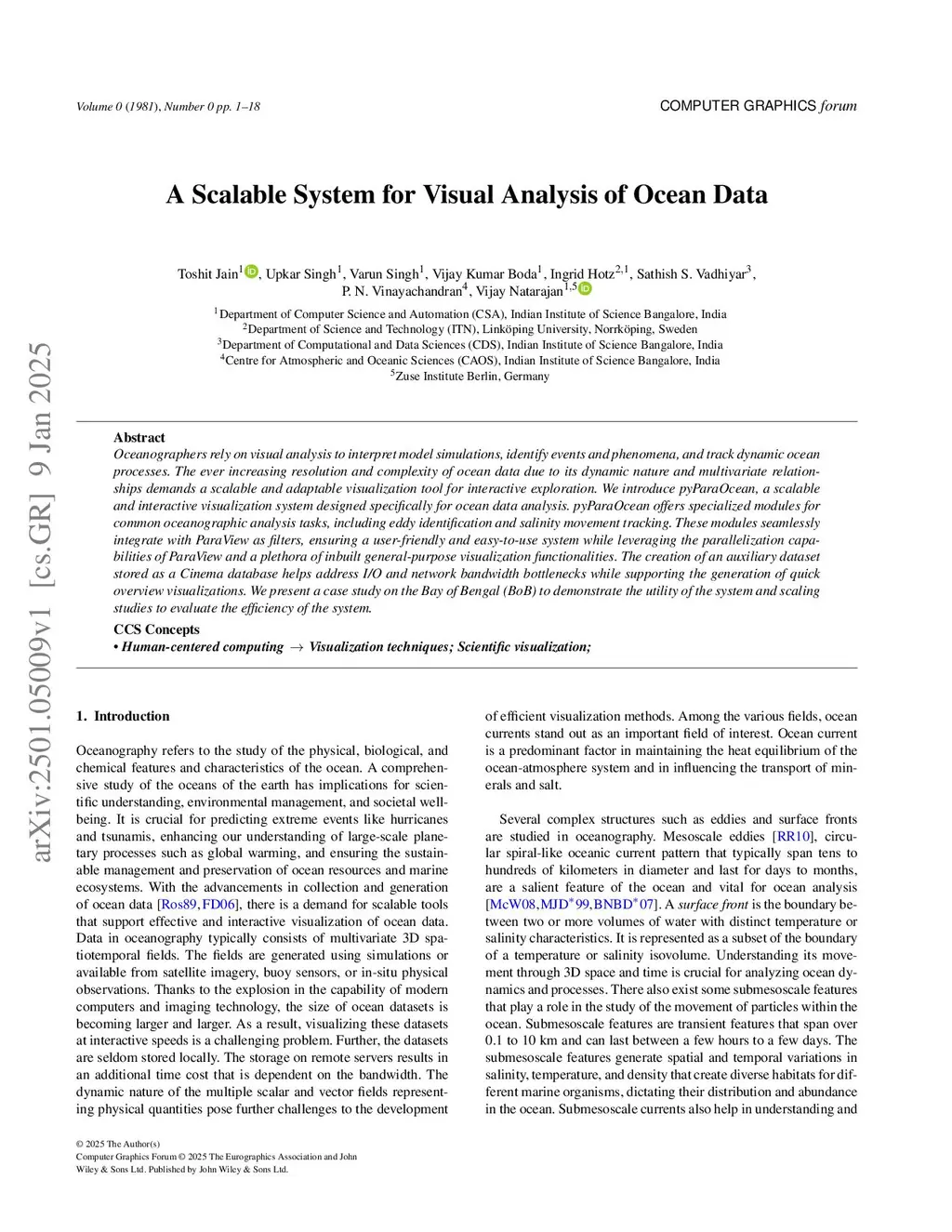 Oceanographers rely on visual analysis to interpret model simulations, identify events and phenomena, and track dynamic ocean processes. The ever increasing resolution and complexity of ocean data due to its dynamic nature and multivariate relationships demands a scalable and adaptable visualization tool for interactive exploration. We introduce pyParaOcean, a scalable and interactive visualization system designed specifically for ocean data analysis. pyParaOcean offers specialized modules for common oceanographic analysis tasks, including eddy identification and salinity movement tracking. These modules seamlessly integrate with ParaView as filters, ensuring a user-friendly and easy-to-use system while leveraging the parallelization capabilities of ParaView and a plethora of inbuilt general-purpose visualization functionalities. The creation of an auxiliary dataset stored as a Cinema database helps address I/O and network bandwidth bottlenecks while supporting the generation of quick overview visualizations. We present a case study on the Bay of Bengal (BoB) to demonstrate the utility of the system and scaling studies to evaluate the efficiency of the system.