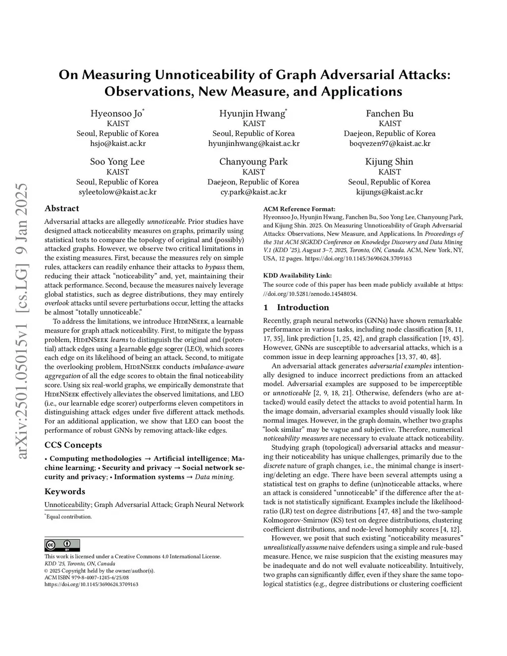 Adversarial attacks are allegedly unnoticeable. Prior studies have designed attack noticeability measures on graphs, primarily using statistical tests to compare the topology of original and (possibly) attacked graphs. However, we observe two critical limitations in the existing measures. First, because the measures rely on simple rules, attackers can readily enhance their attacks to bypass them, reducing their attack "noticeability" and, yet, maintaining their attack performance. Second, because the measures naively leverage global statistics, such as degree distributions, they may entirely overlook attacks until severe perturbations occur, letting the attacks be almost "totally unnoticeable." To address the limitations, we introduce HideNSeek, a learnable measure for graph attack noticeability. First, to mitigate the bypass problem, HideNSeek learns to distinguish the original and (potential) attack edges using a learnable edge scorer (LEO), which scores each edge on its likelihood of being an attack. Second, to mitigate the overlooking problem, HideNSeek conducts imbalance-aware aggregation of all the edge scores to obtain the final noticeability score. Using six real-world graphs, we empirically demonstrate that HideNSeek effectively alleviates the observed limitations, and LEO (i.e., our learnable edge scorer) outperforms eleven competitors in distinguishing attack edges under five different attack methods. For an additional application, we show that LEO boost the performance of robust GNNs by removing attack-like edges.