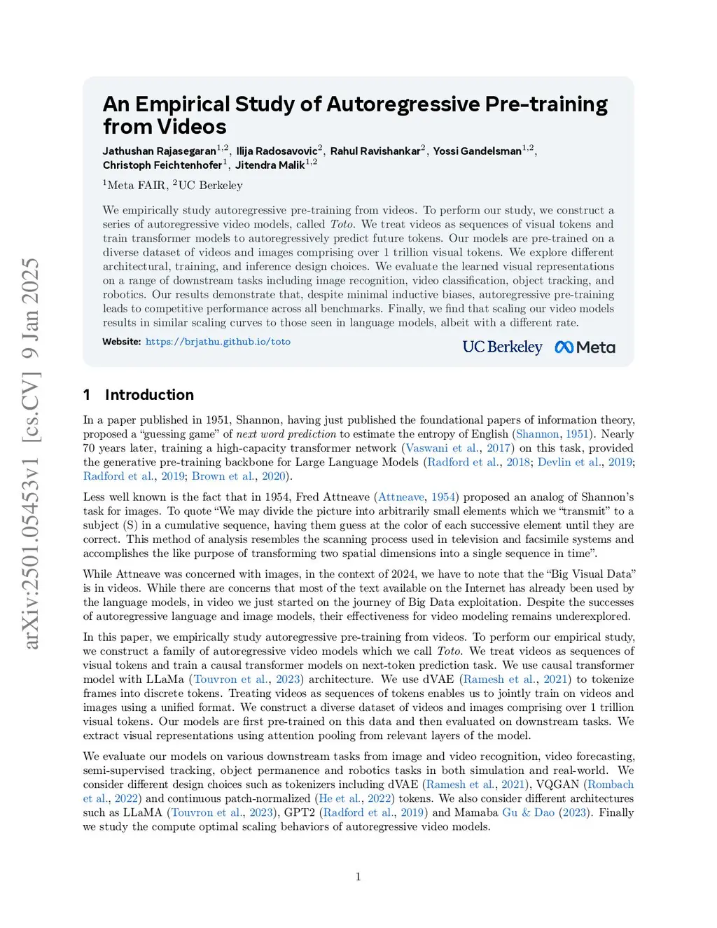 We empirically study autoregressive pre-training from videos. To perform our study, we construct a series of autoregressive video models, called Toto. We treat videos as sequences of visual tokens and train transformer models to autoregressively predict future tokens. Our models are pre-trained on a diverse dataset of videos and images comprising over 1 trillion visual tokens. We explore different architectural, training, and inference design choices. We evaluate the learned visual representations on a range of downstream tasks including image recognition, video classification, object tracking, and robotics. Our results demonstrate that, despite minimal inductive biases, autoregressive pre-training leads to competitive performance across all benchmarks. Finally, we find that scaling our video models results in similar scaling curves to those seen in language models, albeit with a different rate. More details atthis https URL