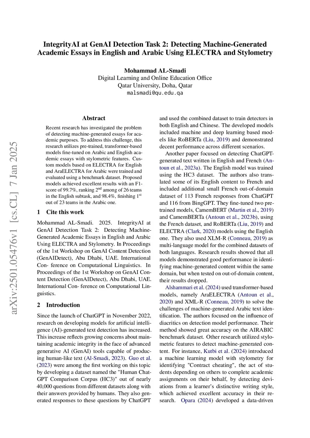 IntegrityAI at GenAI Detection Task 2: Detecting Machine-Generated Academic Essays in English and Arabic Using ELECTRA and Stylometry