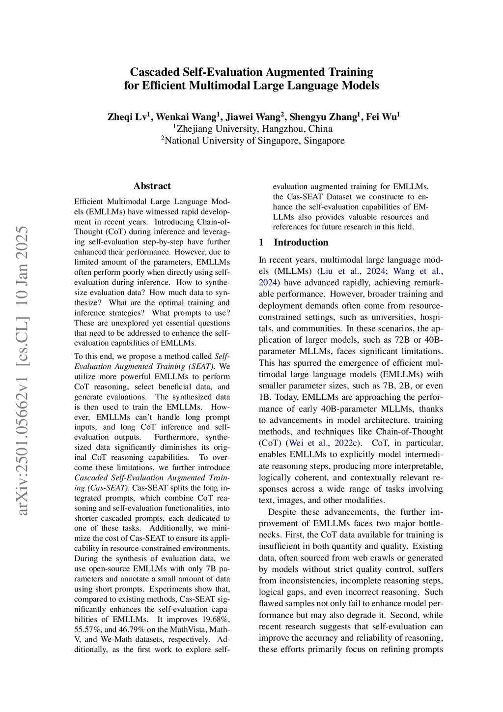 Efficient Multimodal Large Language Models (EMLLMs) can improve performance through Chain-of-Thought (CoT) reasoning, but they have poor self-evaluation capabilities during the CoT reasoning process. This is due to their tendency to simplify the reasoning process and the degradation of self-evaluation ability during downstream task fine-tuning. To address this, we intuitively propose \textit{Self-Evaluation Augmented Training (SEAT)}, which uses more powerful EMLLMs to evaluate CoT reasoning data. The evaluation data is then used to train EMLLMs. However, due to the difficulties EMLLMs face with processing long token input-output sequences, and the degradation of self-evaluation ability as a basis for CoT reasoning, the SEAT method is not fully adapted. Therefore, we further propose \textit{Cascaded Self-Evaluation Augmented Training (Cas-SEAT)}, which converts long prompts into cascaded short prompts, each focusing on a specific task. Additionally, we mix CoT reasoning and self-evaluation data to preserve its CoT reasoning ability while enhancing the self-evaluation capability of EMLLMs. We also conduct \textit{Double-level Data Filtering (DDF)}, which includes source data filtering and labeled data filtering, using both manual selection and MLLMs for filtering. Cas-SEAT and DDF work together to improve the performance of EMLLMs. Experiments show that Cas-SEAT achieves an average improvement of 22.16% across multiple datasets, and DDF significantly reduces the resource consumption of training