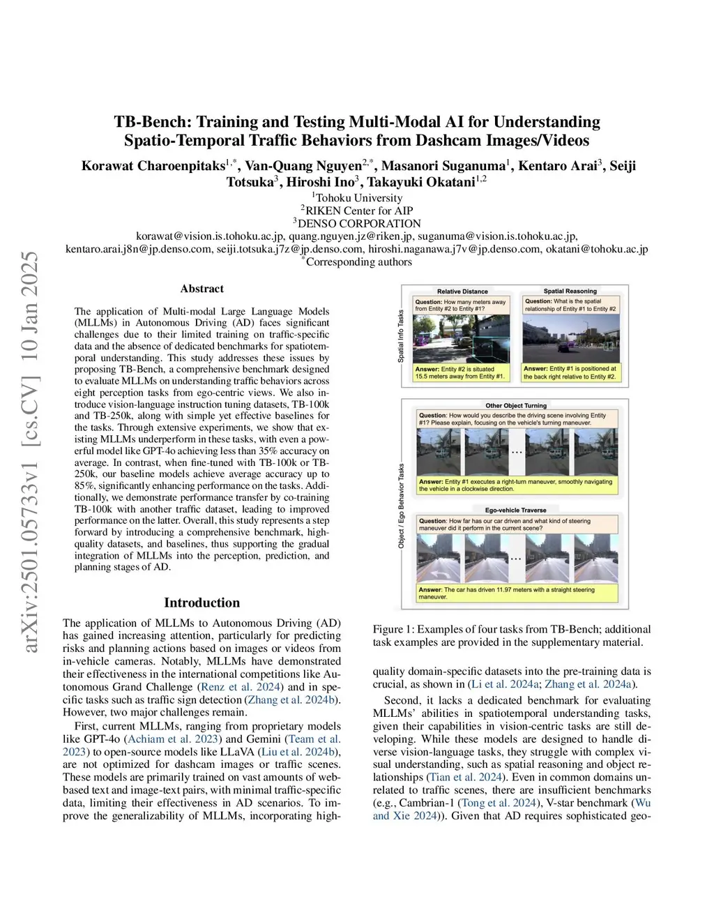 The application of Multi-modal Large Language Models (MLLMs) in Autonomous Driving (AD) faces significant challenges due to their limited training on traffic-specific data and the absence of dedicated benchmarks for spatiotemporal understanding. This study addresses these issues by proposing TB-Bench, a comprehensive benchmark designed to evaluate MLLMs on understanding traffic behaviors across eight perception tasks from ego-centric views. We also introduce vision-language instruction tuning datasets, TB-100k and TB-250k, along with simple yet effective baselines for the tasks. Through extensive experiments, we show that existing MLLMs underperform in these tasks, with even a powerful model like GPT-4o achieving less than 35% accuracy on average. In contrast, when fine-tuned with TB-100k or TB-250k, our baseline models achieve average accuracy up to 85%, significantly enhancing performance on the tasks. Additionally, we demonstrate performance transfer by co-training TB-100k with another traffic dataset, leading to improved performance on the latter. Overall, this study represents a step forward by introducing a comprehensive benchmark, high-quality datasets, and baselines, thus supporting the gradual integration of MLLMs into the perception, prediction, and planning stages of AD.