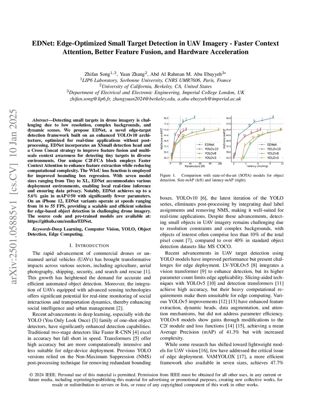 Detecting small targets in drone imagery is challenging due to low resolution, complex backgrounds, and dynamic scenes. We propose EDNet, a novel edge-target detection framework built on an enhanced YOLOv10 architecture, optimized for real-time applications without post-processing. EDNet incorporates an XSmall detection head and a Cross Concat strategy to improve feature fusion and multi-scale context awareness for detecting tiny targets in diverse environments. Our unique C2f-FCA block employs Faster Context Attention to enhance feature extraction while reducing computational complexity. The WIoU loss function is employed for improved bounding box regression. With seven model sizes ranging from Tiny to XL, EDNet accommodates various deployment environments, enabling local real-time inference and ensuring data privacy. Notably, EDNet achieves up to a 5.6% gain in mAP@50 with significantly fewer parameters. On an iPhone 12, EDNet variants operate at speeds ranging from 16 to 55 FPS, providing a scalable and efficient solution for edge-based object detection in challenging drone imagery. The source code and pre-trained models are available at:this https URL.