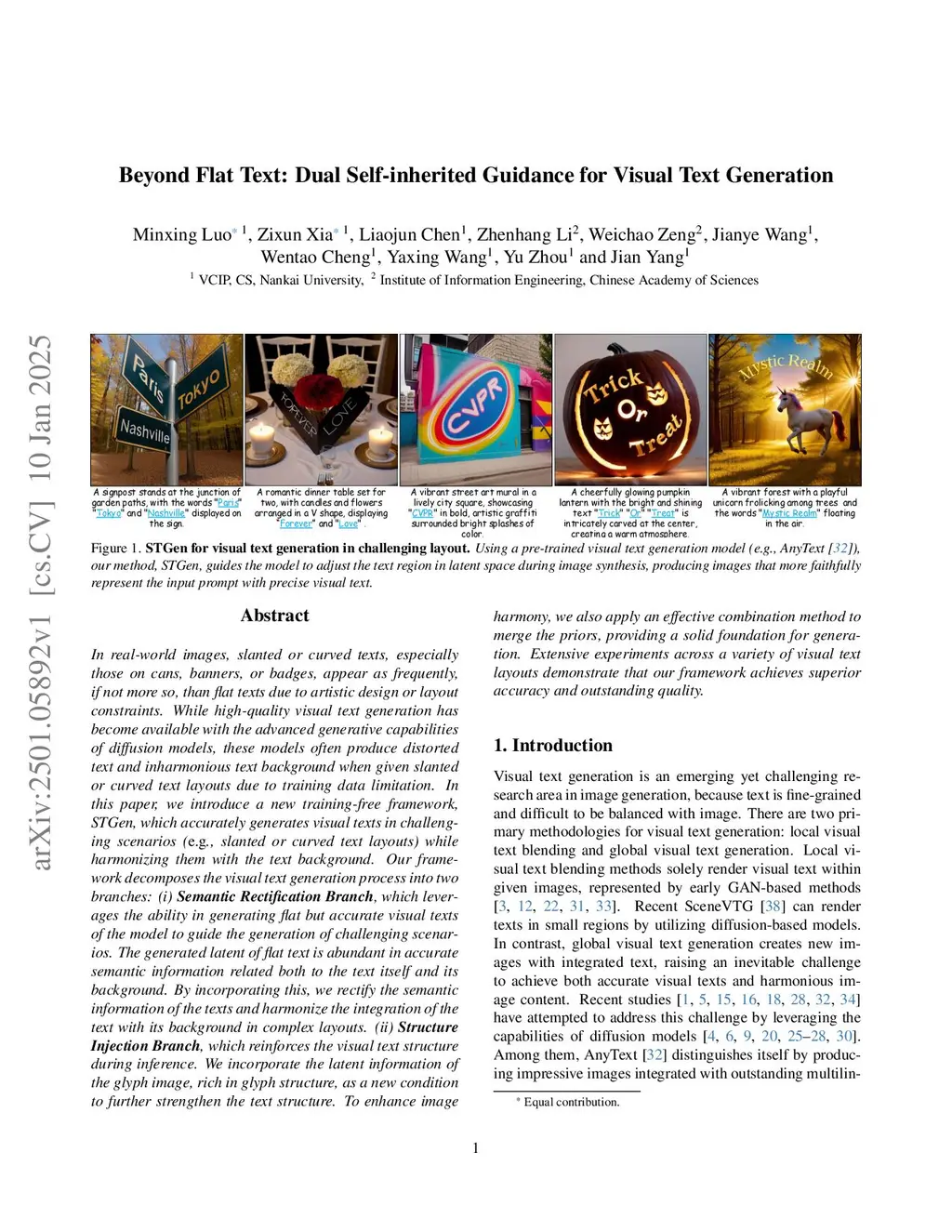In real-world images, slanted or curved texts, especially those on cans, banners, or badges, appear as frequently, if not more so, than flat texts due to artistic design or layout constraints. While high-quality visual text generation has become available with the advanced generative capabilities of diffusion models, these models often produce distorted text and inharmonious text background when given slanted or curved text layouts due to training data limitation. In this paper, we introduce a new training-free framework, STGen, which accurately generates visual texts in challenging scenarios (\eg, slanted or curved text layouts) while harmonizing them with the text background. Our framework decomposes the visual text generation process into two branches: (i) \textbf{Semantic Rectification Branch}, which leverages the ability in generating flat but accurate visual texts of the model to guide the generation of challenging scenarios. The generated latent of flat text is abundant in accurate semantic information related both to the text itself and its background. By incorporating this, we rectify the semantic information of the texts and harmonize the integration of the text with its background in complex layouts. (ii) \textbf{Structure Injection Branch}, which reinforces the visual text structure during inference. We incorporate the latent information of the glyph image, rich in glyph structure, as a new condition to further strengthen the text structure. To enhance image harmony, we also apply an effective combination method to merge the priors, providing a solid foundation for generation. Extensive experiments across a variety of visual text layouts demonstrate that our framework achieves superior accuracy and outstanding quality.