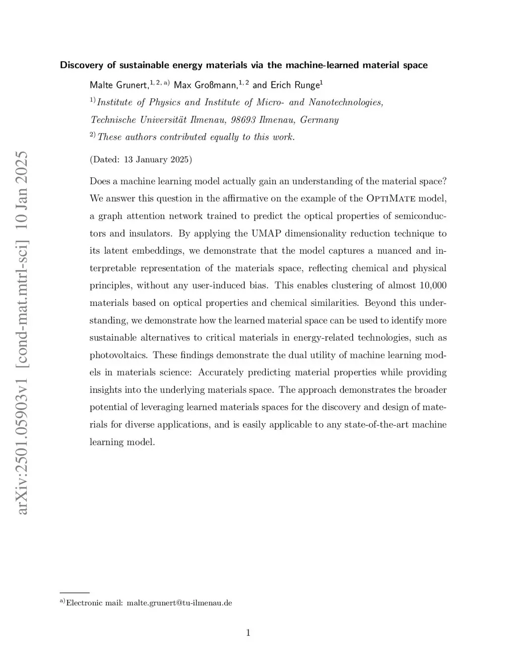 Does a machine learning model actually gain an understanding of the material space? We answer this question in the affirmative on the example of the OptiMate model, a graph attention network trained to predict the optical properties of semiconductors and insulators. By applying the UMAP dimensionality reduction technique to its latent embeddings, we demonstrate that the model captures a nuanced and interpretable representation of the materials space, reflecting chemical and physical principles, without any user-induced bias. This enables clustering of almost 10,000 materials based on optical properties and chemical similarities. Beyond this understanding, we demonstrate how the learned material space can be used to identify more sustainable alternatives to critical materials in energy-related technologies, such as photovoltaics. These findings demonstrate the dual utility of machine learning models in materials science: Accurately predicting material properties while providing insights into the underlying materials space. The approach demonstrates the broader potential of leveraging learned materials spaces for the discovery and design of materials for diverse applications, and is easily applicable to any state-of-the-art machine learning model.