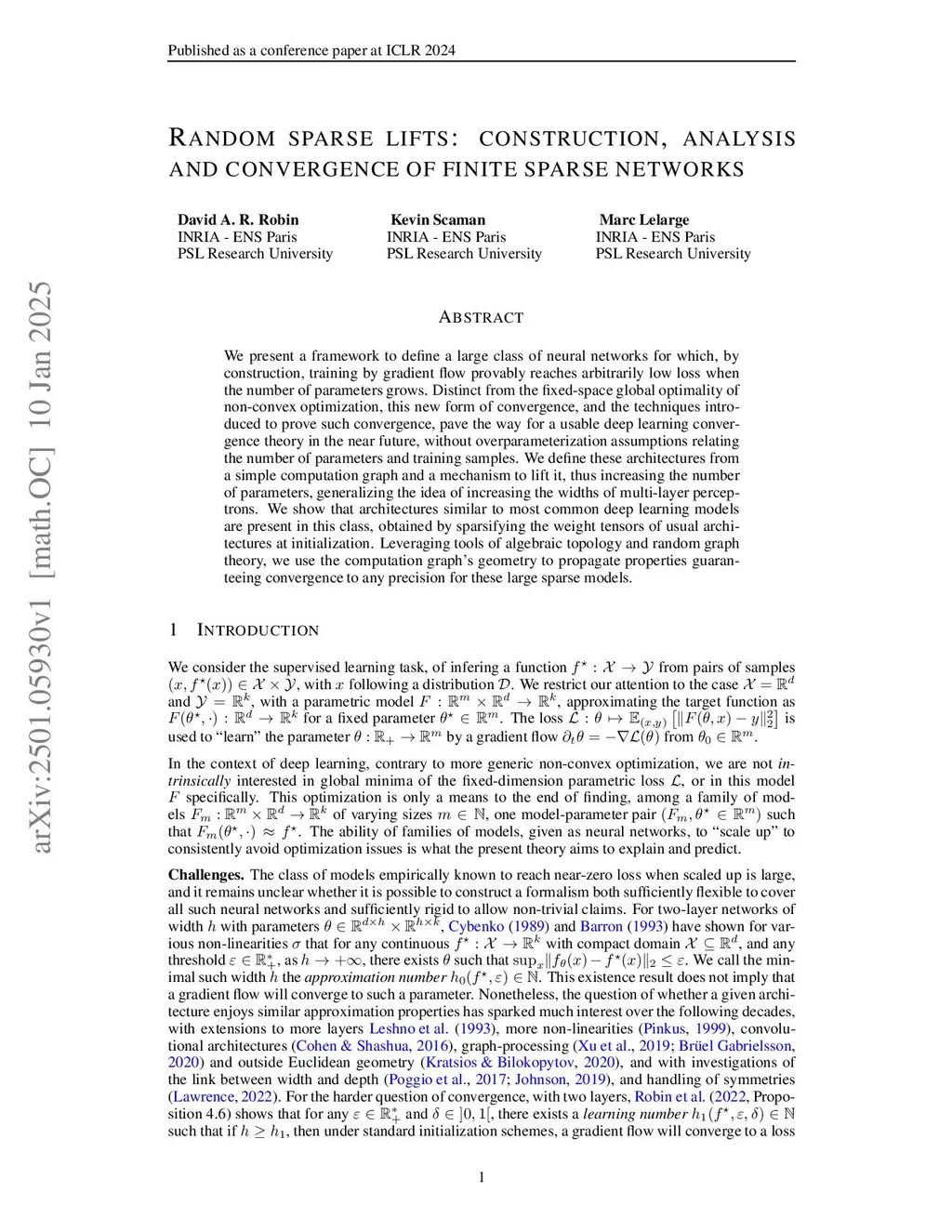 We present a framework to define a large class of neural networks for which, by construction, training by gradient flow provably reaches arbitrarily low loss when the number of parameters grows. Distinct from the fixed-space global optimality of non-convex optimization, this new form of convergence, and the techniques introduced to prove such convergence, pave the way for a usable deep learning convergence theory in the near future, without overparameterization assumptions relating the number of parameters and training samples. We define these architectures from a simple computation graph and a mechanism to lift it, thus increasing the number of parameters, generalizing the idea of increasing the widths of multi-layer perceptrons. We show that architectures similar to most common deep learning models are present in this class, obtained by sparsifying the weight tensors of usual architectures at initialization. Leveraging tools of algebraic topology and random graph theory, we use the computation graph's geometry to propagate properties guaranteeing convergence to any precision for these large sparse models.