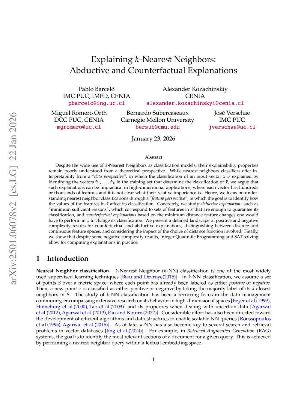 Despite the wide use of -Nearest Neighbors as classification models, their explainability properties remain poorly understood from a theoretical perspective.While nearest neighbors classifiers offer interpretability from a ``data perspective'', in which the classification of an input vector is explained by identifying the vectors in the training set that determine the classification of , we argue that such explanations can be impractical in high-dimensional applications, where each vector has hundreds or thousands of features and it is not clear what their relative importance is. Hence, we focus on understanding nearest neighbor classifications through a ``feature perspective'', in which the goal is to identify how the values of the features in affect its classification. Concretely, we study abductive explanations such as ``minimum sufficient reasons'', which correspond to sets of features in that are enough to guarantee its classification, and counterfactual explanations based on the minimum distance feature changes one would have to perform in to change its classification. We present a detailed landscape of positive and negative complexity results for counterfactual and abductive explanations, distinguishing between discrete and continuous feature spaces, and considering the impact of the choice of distance function involved. Finally, we show that despite some negative complexity results, Integer Quadratic Programming and SAT solving allow for computing explanations in practice.