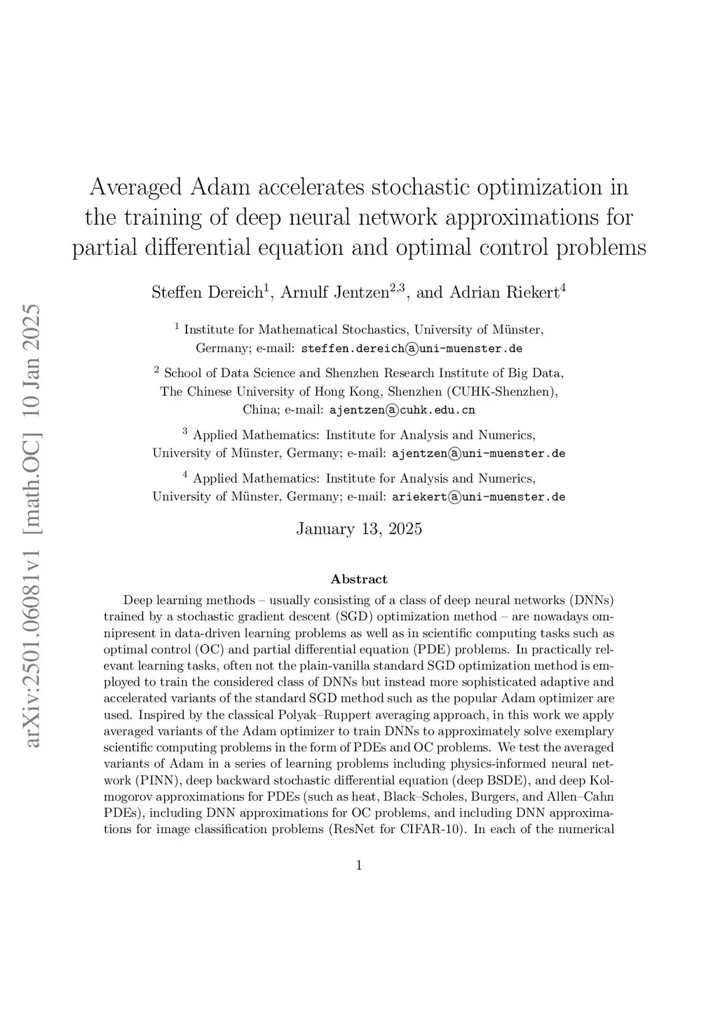 Averaged Adam accelerates stochastic optimization in the training of deep neural network approximations for partial differential equation and optimal control problems