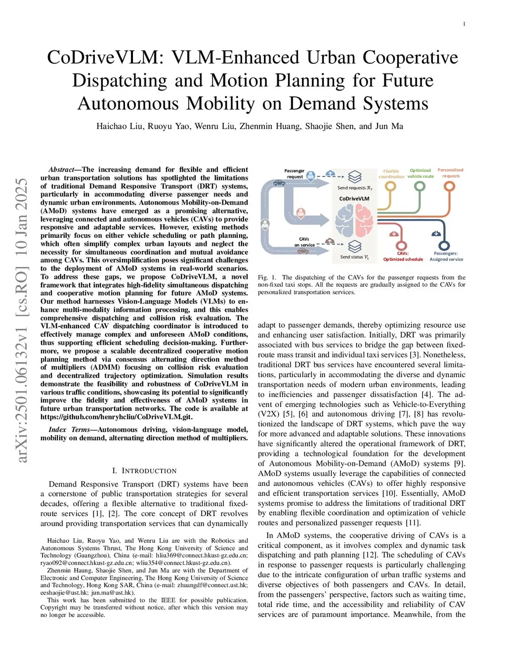 The increasing demand for flexible and efficient urban transportation solutions has spotlighted the limitations of traditional Demand Responsive Transport (DRT) systems, particularly in accommodating diverse passenger needs and dynamic urban environments. Autonomous Mobility-on-Demand (AMoD) systems have emerged as a promising alternative, leveraging connected and autonomous vehicles (CAVs) to provide responsive and adaptable services. However, existing methods primarily focus on either vehicle scheduling or path planning, which often simplify complex urban layouts and neglect the necessity for simultaneous coordination and mutual avoidance among CAVs. This oversimplification poses significant challenges to the deployment of AMoD systems in real-world scenarios. To address these gaps, we propose CoDriveVLM, a novel framework that integrates high-fidelity simultaneous dispatching and cooperative motion planning for future AMoD systems. Our method harnesses Vision-Language Models (VLMs) to enhance multi-modality information processing, and this enables comprehensive dispatching and collision risk evaluation. The VLM-enhanced CAV dispatching coordinator is introduced to effectively manage complex and unforeseen AMoD conditions, thus supporting efficient scheduling decision-making. Furthermore, we propose a scalable decentralized cooperative motion planning method via consensus alternating direction method of multipliers (ADMM) focusing on collision risk evaluation and decentralized trajectory optimization. Simulation results demonstrate the feasibility and robustness of CoDriveVLM in various traffic conditions, showcasing its potential to significantly improve the fidelity and effectiveness of AMoD systems in future urban transportation networks. The code is available atthis https URL.