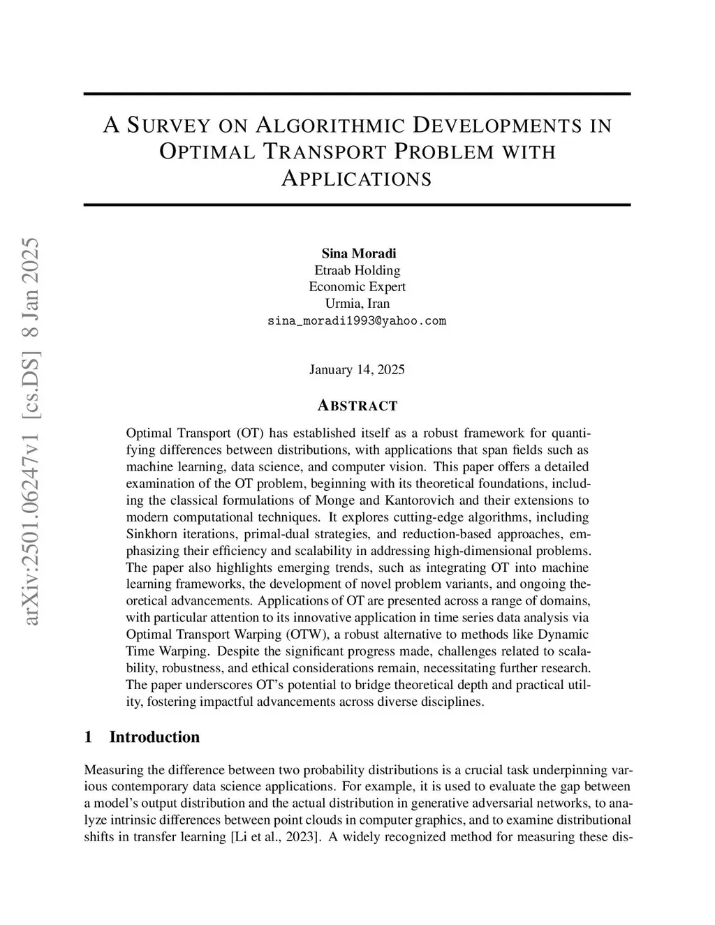 Optimal Transport (OT) has established itself as a robust framework for quantifying differences between distributions, with applications that span fields such as machine learning, data science, and computer vision. This paper offers a detailed examination of the OT problem, beginning with its theoretical foundations, including the classical formulations of Monge and Kantorovich and their extensions to modern computational techniques. It explores cutting-edge algorithms, including Sinkhorn iterations, primal-dual strategies, and reduction-based approaches, emphasizing their efficiency and scalability in addressing high-dimensional problems. The paper also highlights emerging trends, such as integrating OT into machine learning frameworks, the development of novel problem variants, and ongoing theoretical advancements. Applications of OT are presented across a range of domains, with particular attention to its innovative application in time series data analysis via Optimal Transport Warping (OTW), a robust alternative to methods like Dynamic Time Warping. Despite the significant progress made, challenges related to scalability, robustness, and ethical considerations remain, necessitating further research. The paper underscores OT's potential to bridge theoretical depth and practical utility, fostering impactful advancements across diverse disciplines.