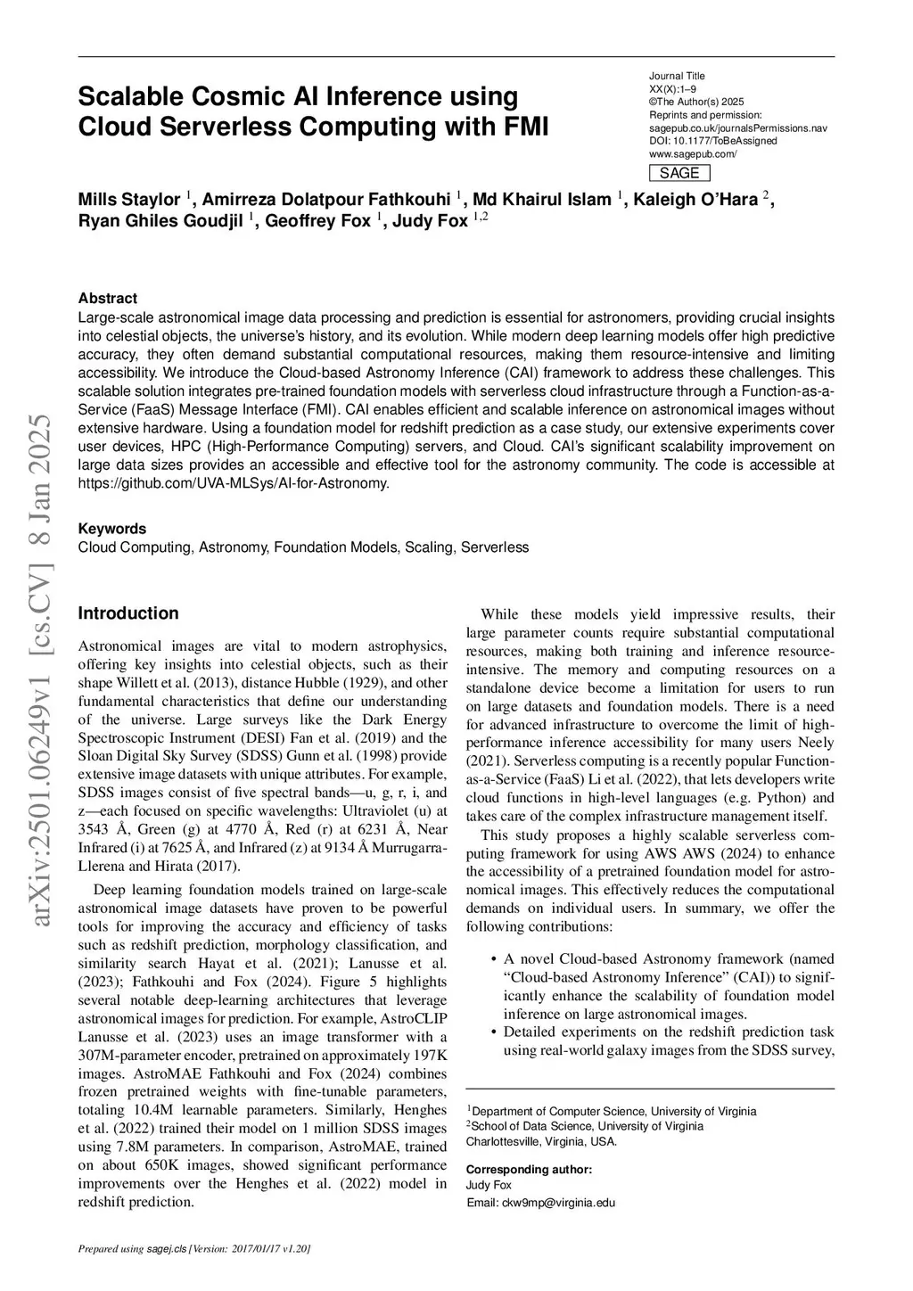Large-scale astronomical image data processing and prediction are essential for astronomers, providing crucial insights into celestial objects, the universe's history, and its evolution. While modern deep learning models offer high predictive accuracy, they often demand substantial computational resources, making them resource-intensive and limiting accessibility. We introduce the Cloud-based Astronomy Inference (CAI) framework to address these challenges. This scalable solution integrates pre-trained foundation models with serverless cloud infrastructure through a Function-as-a-Service (FaaS). CAI enables efficient and scalable inference on astronomical images without extensive hardware. Using a foundation model for redshift prediction as a case study, our extensive experiments cover user devices, HPC (High-Performance Computing) servers, and Cloud. Using redshift prediction with the AstroMAE model demonstrated CAI's scalability and efficiency, achieving inference on a 12.6 GB dataset in only 28 seconds compared to 140.8 seconds on HPC GPUs and 1793 seconds on HPC CPUs. CAI also achieved significantly higher throughput, reaching 18.04 billion bits per second (bps), and maintained near-constant inference times as data sizes increased, all at minimal computational cost (under $5 per experiment). We also process large-scale data up to 1 TB to show CAI's effectiveness at scale. CAI thus provides a highly scalable, accessible, and cost-effective inference solution for the astronomy community. The code is accessible atthis https URL.