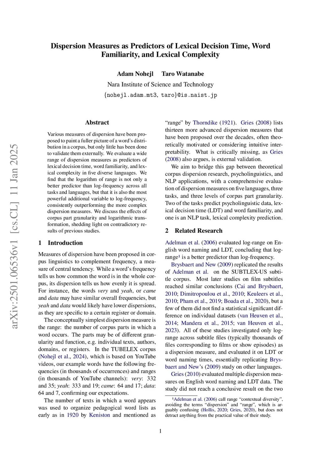 Dispersion Measures as Predictors of Lexical Decision Time, Word Familiarity, and Lexical Complexity