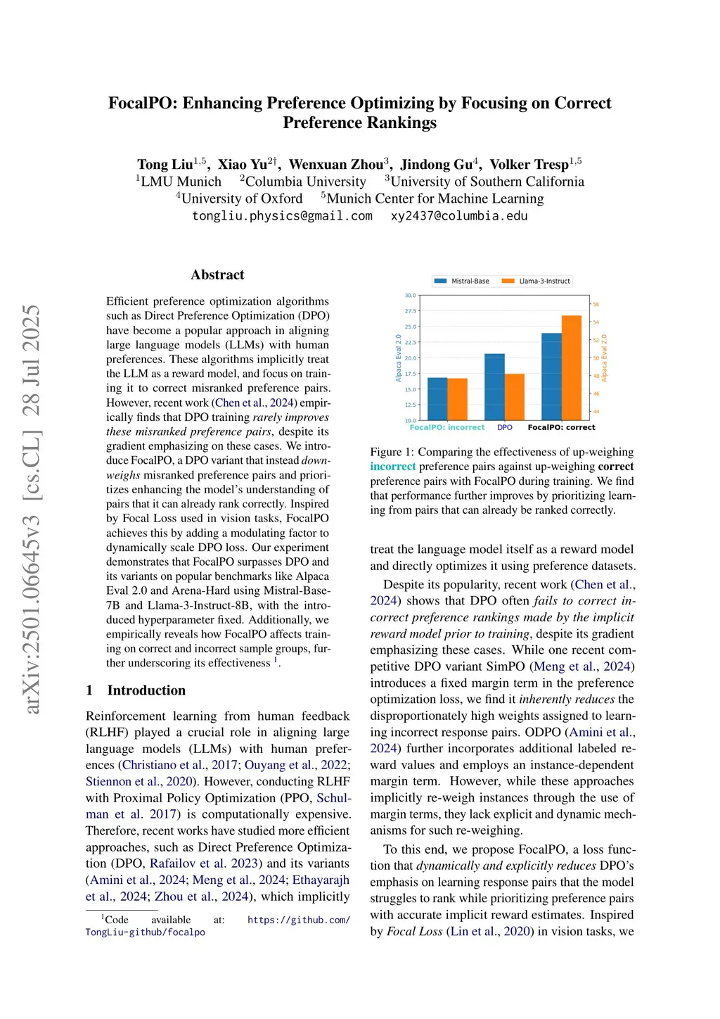Efficient preference optimization algorithms such as Direct Preference Optimization (DPO) have become a popular approach in aligning large language models (LLMs) with human preferences. These algorithms implicitly treat the LLM as a reward model, and focus on training it to correct misranked preference pairs. However, recent work~\citep{chen2024preference} empirically finds that DPO training \textit{rarely improves these misranked preference pairs}, despite its gradient emphasizing on these cases. We introduce FocalPO, a DPO variant that instead \textit{down-weighs} misranked preference pairs and prioritizes enhancing the model's understanding of pairs that it can already rank correctly. Inspired by Focal Loss used in vision tasks, FocalPO achieves this by adding a modulating factor to dynamically scale DPO loss. Our experiment demonstrates that FocalPO surpasses DPO and its variants on popular benchmarks like Alpaca Eval 2.0 using Mistral-Base-7B and Llama-3-Instruct-8B, with the introduced hyperparameter fixed. Additionally, we empirically reveals how FocalPO affects training on correct and incorrect sample groups, further underscoring its effectiveness.