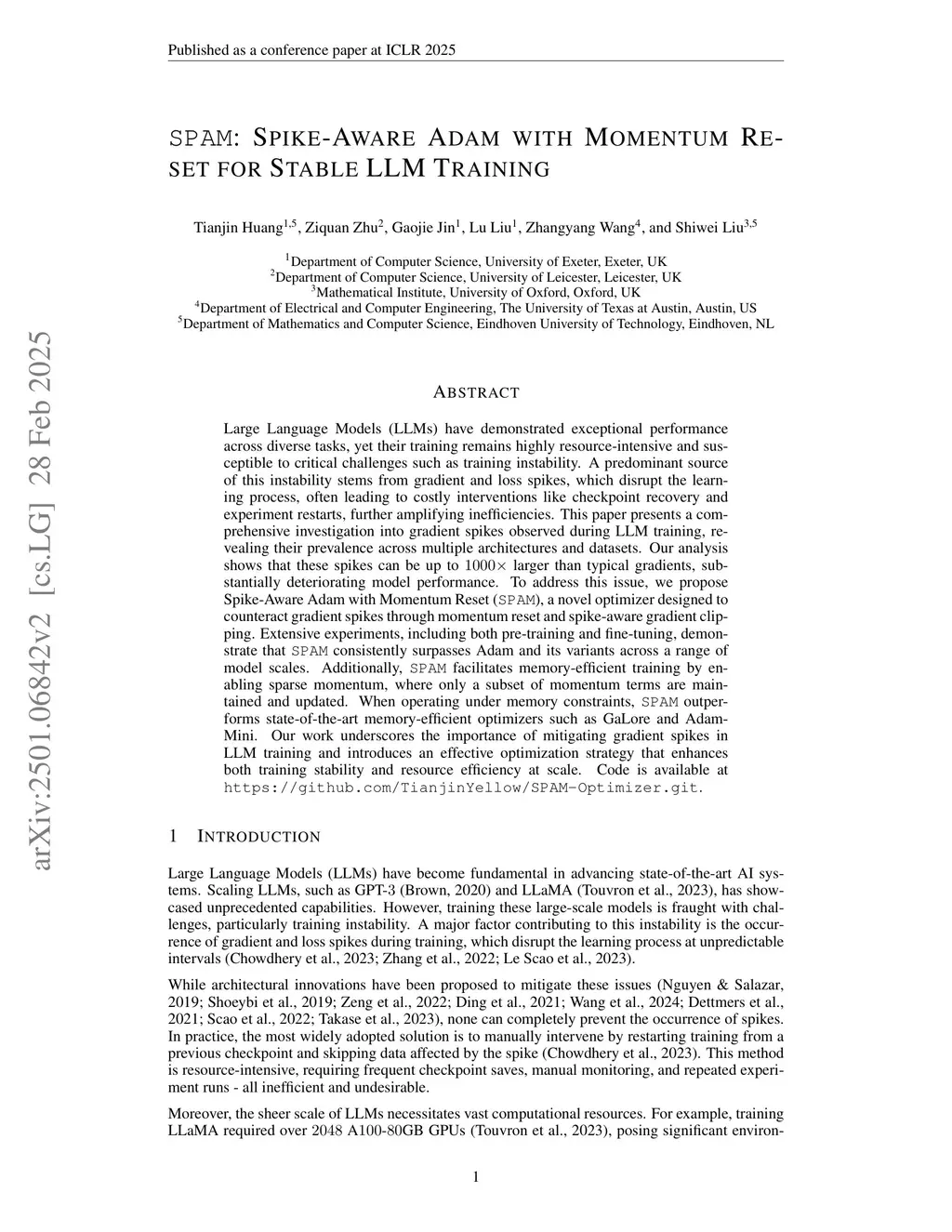 Large Language Models (LLMs) have demonstrated exceptional performance across diverse tasks, yet their training remains highly resource-intensive and susceptible to critical challenges such as training instability. A predominant source of this instability stems from gradient and loss spikes, which disrupt the learning process, often leading to costly interventions like checkpoint recovery and experiment restarts, further amplifying inefficiencies. This paper presents a comprehensive investigation into gradient spikes observed during LLM training, revealing their prevalence across multiple architectures and datasets. Our analysis shows that these spikes can be up to larger than typical gradients, substantially deteriorating model performance. To address this issue, we propose Spike-Aware Adam with Momentum Reset SPAM, a novel optimizer designed to counteract gradient spikes through momentum reset and spike-aware gradient clipping. Extensive experiments, including both pre-training and fine-tuning, demonstrate that SPAM consistently surpasses Adam and its variants across various tasks, including (1) LLM pre-training from 60M to 1B, (2) 4-bit LLM pre-training,(3) reinforcement learning, and (4) Time Series Forecasting. Additionally, SPAM facilitates memory-efficient training by enabling sparse momentum, where only a subset of momentum terms are maintained and updated. When operating under memory constraints, SPAM outperforms state-of-the-art memory-efficient optimizers such as GaLore and Adam-Mini. Our work underscores the importance of mitigating gradient spikes in LLM training and introduces an effective optimization strategy that enhances both training stability and resource efficiency at scale. Code is available atthis https URL