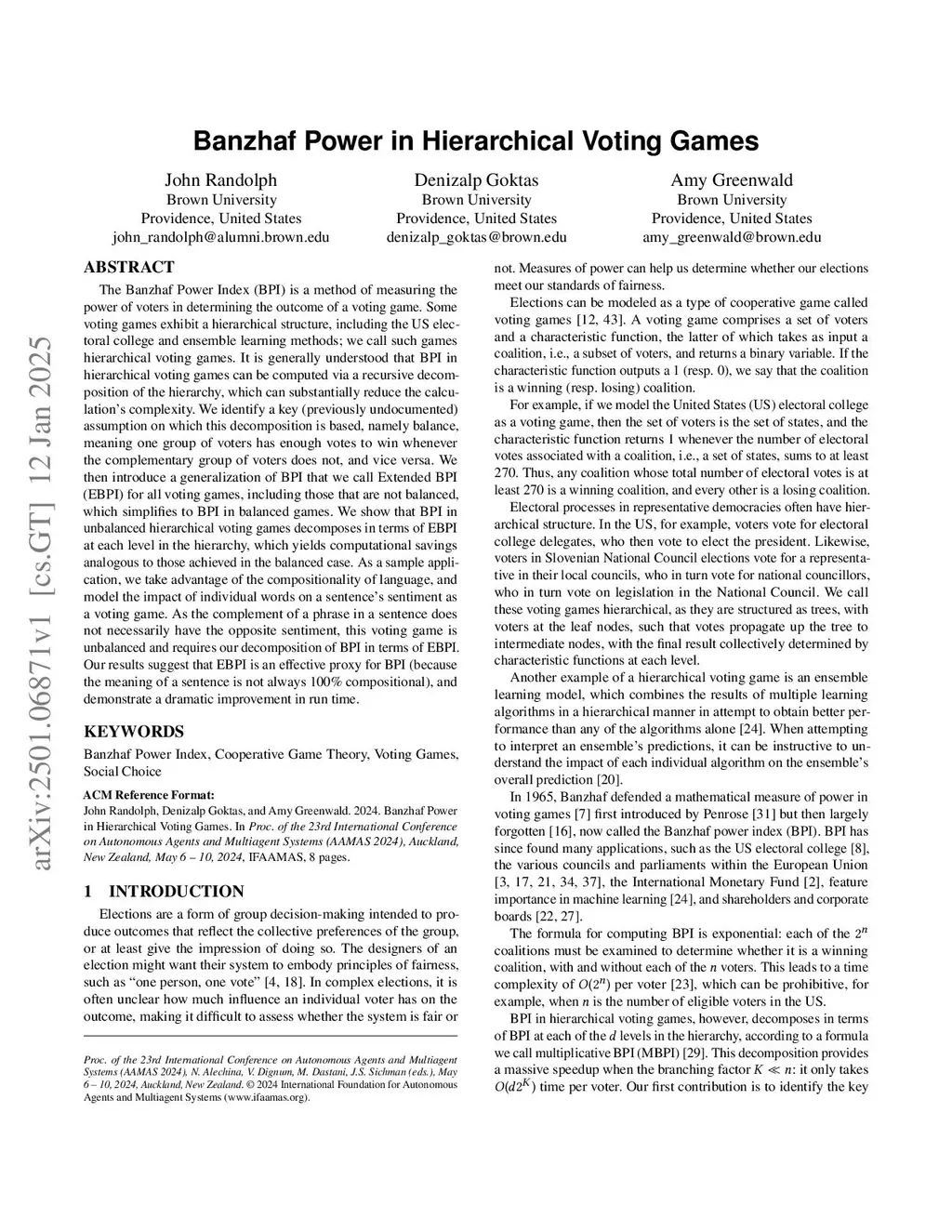 The Banzhaf Power Index (BPI) is a method of measuring the power of voters in determining the outcome of a voting game. Some voting games exhibit a hierarchical structure, including the US electoral college and ensemble learning methods; we call such games hierarchical voting games. It is generally understood that BPI in hierarchical voting games can be computed via a recursive decomposition of the hierarchy, which can substantially reduce the calculation's complexity. We identify a key (previously undocumented) assumption on which this decomposition is based, namely balance, meaning one group of voters has enough votes to win whenever the complementary group of voters does not, and vice versa. We then introduce a generalization of BPI that we call Extended BPI (EBPI) for all voting games, including those that are not balanced, which simplifies to BPI in balanced games. We show that BPI in unbalanced hierarchical voting games decomposes in terms of EBPI at each level in the hierarchy, which yields computational savings analogous to those achieved in the balanced case. As a sample application, we take advantage of the compositionality of language, and model the impact of individual words on a sentence's sentiment as a voting game. As the complement of a phrase in a sentence does not necessarily have the opposite sentiment, this voting game is unbalanced and requires our decomposition of BPI in terms of EBPI. Our results suggest that EBPI is an effective proxy for BPI (because the meaning of a sentence is not always 100\% compositional), and demonstrate a dramatic improvement in run time.