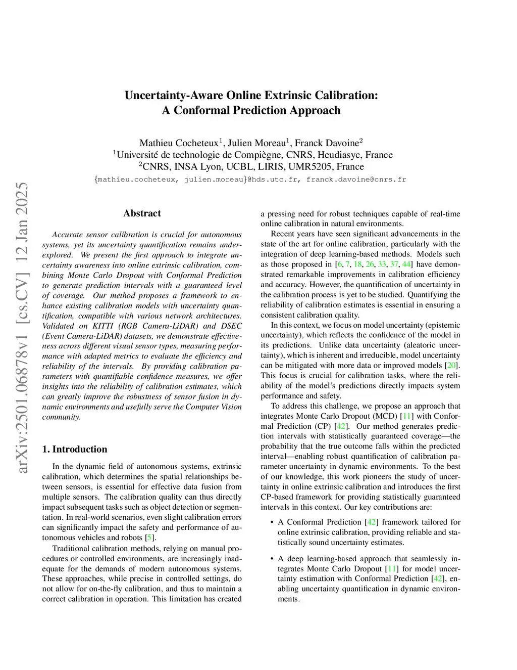Accurate sensor calibration is crucial for autonomous systems, yet its uncertainty quantification remains underexplored. We present the first approach to integrate uncertainty awareness into online extrinsic calibration, combining Monte Carlo Dropout with Conformal Prediction to generate prediction intervals with a guaranteed level of coverage. Our method proposes a framework to enhance existing calibration models with uncertainty quantification, compatible with various network architectures. Validated on KITTI (RGB Camera-LiDAR) and DSEC (Event Camera-LiDAR) datasets, we demonstrate effectiveness across different visual sensor types, measuring performance with adapted metrics to evaluate the efficiency and reliability of the intervals. By providing calibration parameters with quantifiable confidence measures, we offer insights into the reliability of calibration estimates, which can greatly improve the robustness of sensor fusion in dynamic environments and usefully serve the Computer Vision community.