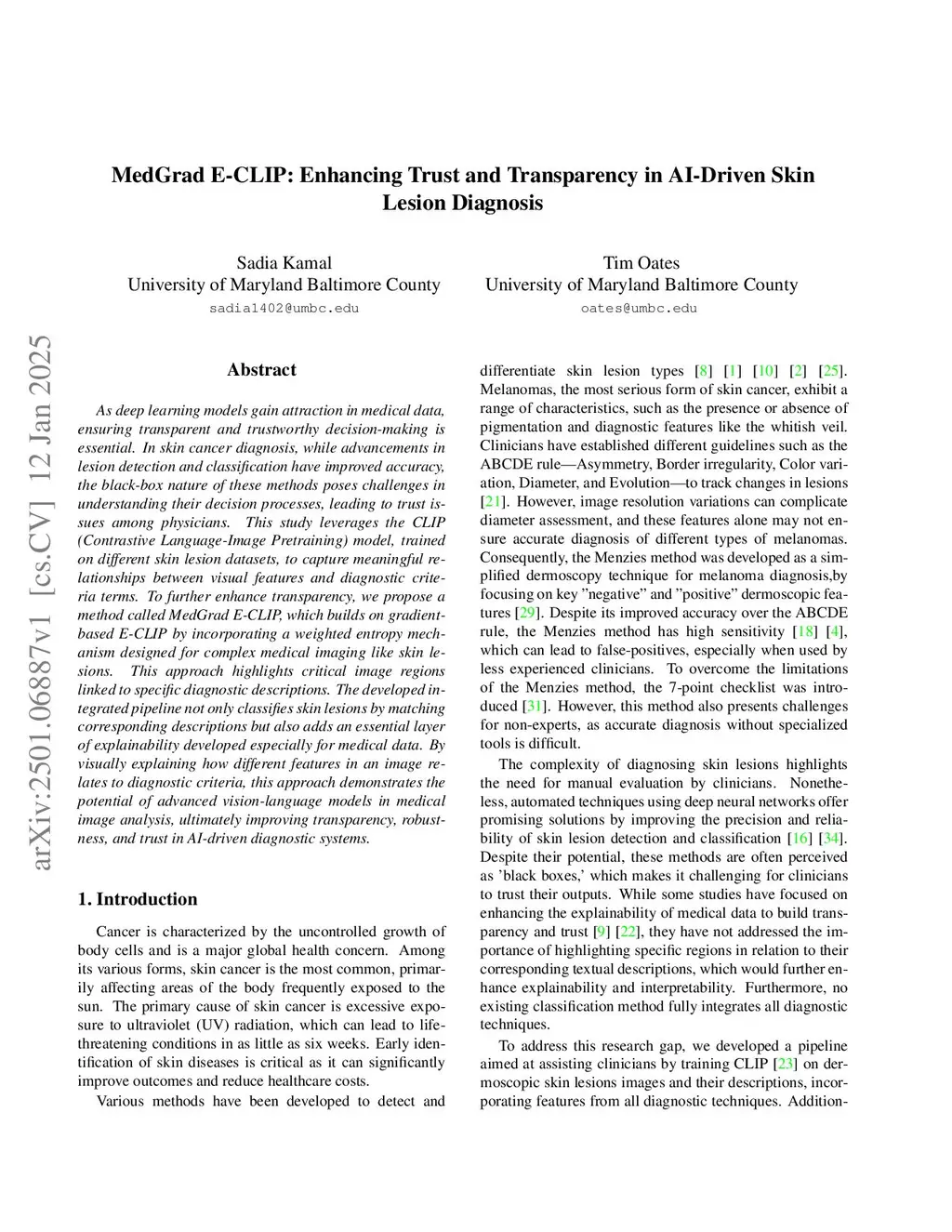 As deep learning models gain attraction in medical data, ensuring transparent and trustworthy decision-making is essential. In skin cancer diagnosis, while advancements in lesion detection and classification have improved accuracy, the black-box nature of these methods poses challenges in understanding their decision processes, leading to trust issues among physicians. This study leverages the CLIP (Contrastive Language-Image Pretraining) model, trained on different skin lesion datasets, to capture meaningful relationships between visual features and diagnostic criteria terms. To further enhance transparency, we propose a method called MedGrad E-CLIP, which builds on gradient-based E-CLIP by incorporating a weighted entropy mechanism designed for complex medical imaging like skin lesions. This approach highlights critical image regions linked to specific diagnostic descriptions. The developed integrated pipeline not only classifies skin lesions by matching corresponding descriptions but also adds an essential layer of explainability developed especially for medical data. By visually explaining how different features in an image relates to diagnostic criteria, this approach demonstrates the potential of advanced vision-language models in medical image analysis, ultimately improving transparency, robustness, and trust in AI-driven diagnostic systems.