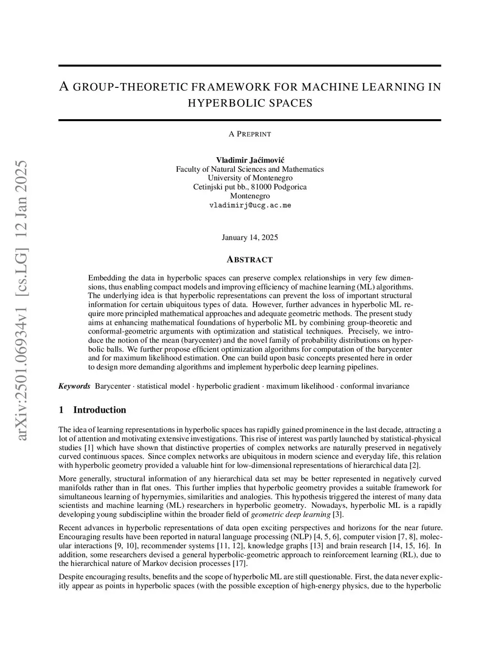Embedding the data in hyperbolic spaces can preserve complex relationships in very few dimensions, thus enabling compact models and improving efficiency of machine learning (ML) algorithms. The underlying idea is that hyperbolic representations can prevent the loss of important structural information for certain ubiquitous types of data. However, further advances in hyperbolic ML require more principled mathematical approaches and adequate geometric methods. The present study aims at enhancing mathematical foundations of hyperbolic ML by combining group-theoretic and conformal-geometric arguments with optimization and statistical techniques. Precisely, we introduce the notion of the mean (barycenter) and the novel family of probability distributions on hyperbolic balls. We further propose efficient optimization algorithms for computation of the barycenter and for maximum likelihood estimation. One can build upon basic concepts presented here in order to design more demanding algorithms and implement hyperbolic deep learning pipelines.