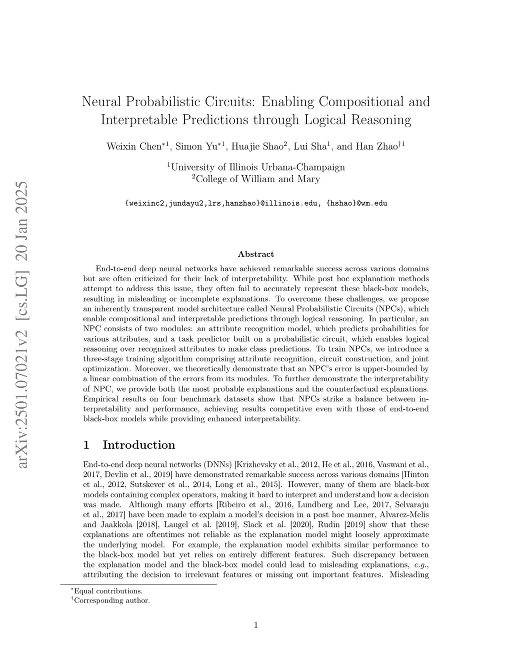 End-to-end deep neural networks have achieved remarkable success across various domains but are often criticized for their lack of interpretability. While post hoc explanation methods attempt to address this issue, they often fail to accurately represent these black-box models, resulting in misleading or incomplete explanations. To overcome these challenges, we propose an inherently transparent model architecture called Neural Probabilistic Circuits (NPCs), which enable compositional and interpretable predictions through logical reasoning. In particular, an NPC consists of two modules: an attribute recognition model, which predicts probabilities for various attributes, and a task predictor built on a probabilistic circuit, which enables logical reasoning over recognized attributes to make class predictions. To train NPCs, we introduce a three-stage training algorithm comprising attribute recognition, circuit construction, and joint optimization. Moreover, we theoretically demonstrate that an NPC's error is upper-bounded by a linear combination of the errors from its modules. To further demonstrate the interpretability of NPC, we provide both the most probable explanations and the counterfactual explanations. Empirical results on four benchmark datasets show that NPCs strike a balance between interpretability and performance, achieving results competitive even with those of end-to-end black-box models while providing enhanced interpretability.