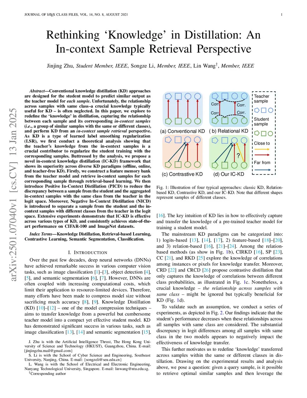 Conventional knowledge distillation (KD) approaches are designed for the student model to predict similar output as the teacher model for each sample. Unfortunately, the relationship across samples with same class is often neglected. In this paper, we explore to redefine the knowledge in distillation, capturing the relationship between each sample and its corresponding in-context samples (a group of similar samples with the same or different classes), and perform KD from an in-context sample retrieval perspective. As KD is a type of learned label smoothing regularization (LSR), we first conduct a theoretical analysis showing that the teacher's knowledge from the in-context samples is a crucial contributor to regularize the student training with the corresponding samples. Buttressed by the analysis, we propose a novel in-context knowledge distillation (IC-KD) framework that shows its superiority across diverse KD paradigms (offline, online, and teacher-free KD). Firstly, we construct a feature memory bank from the teacher model and retrieve in-context samples for each corresponding sample through retrieval-based learning. We then introduce Positive In-Context Distillation (PICD) to reduce the discrepancy between a sample from the student and the aggregated in-context samples with the same class from the teacher in the logit space. Moreover, Negative In-Context Distillation (NICD) is introduced to separate a sample from the student and the in-context samples with different classes from the teacher in the logit space. Extensive experiments demonstrate that IC-KD is effective across various types of KD, and consistently achieves state-of-the-art performance on CIFAR-100 and ImageNet datasets.