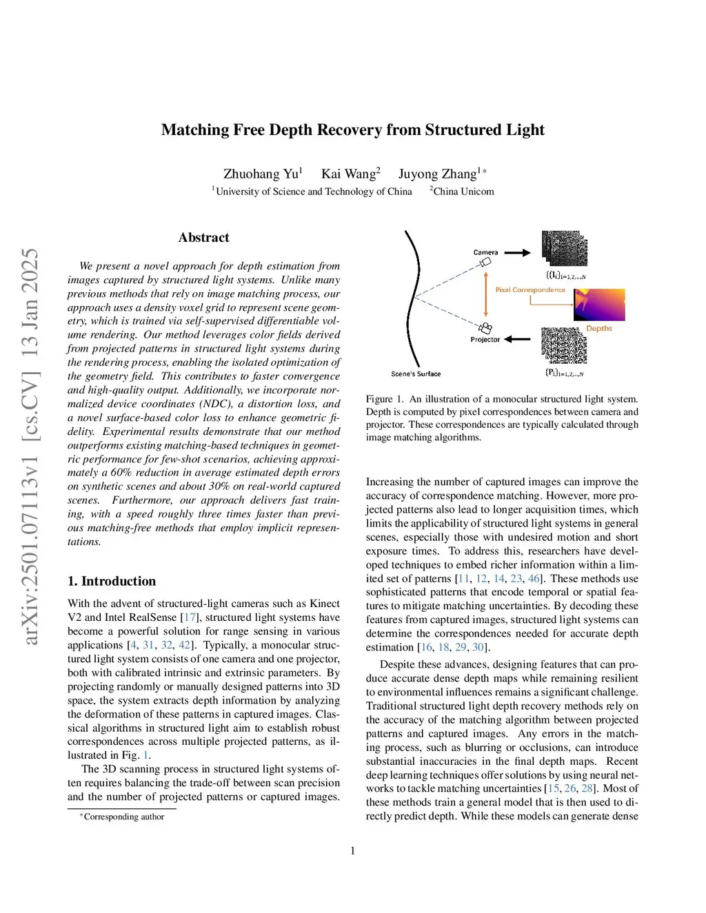 We introduce a novel approach for depth estimation using images obtained from monocular structured light systems. In contrast to many existing methods that depend on image matching, our technique employs a density voxel grid to represent scene geometry. This grid is trained through self-supervised differentiable volume rendering. Our method leverages color fields derived from the projected patterns in structured light systems during the rendering process, facilitating the isolated optimization of the geometry field. This innovative approach leads to faster convergence and high-quality results. Additionally, we integrate normalized device coordinates (NDC), a distortion loss, and a distinctive surface-based color loss to enhance geometric fidelity. Experimental results demonstrate that our method outperforms current matching-based techniques in terms of geometric performance in few-shot scenarios, achieving an approximately 30% reduction in average estimated depth errors for both synthetic scenes and real-world captured scenes. Moreover, our approach allows for rapid training, being approximately three times faster than previous matching-free methods that utilize implicit representations.