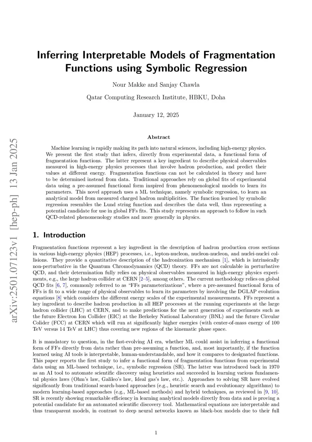 Machine learning is rapidly making its path into natural sciences, including high-energy physics. We present the first study that infers, directly from experimental data, a functional form of fragmentation functions. The latter represent a key ingredient to describe physical observables measured in high-energy physics processes that involve hadron production, and predict their values at different energy. Fragmentation functions can not be calculated in theory and have to be determined instead from data. Traditional approaches rely on global fits of experimental data using a pre-assumed functional form inspired from phenomenological models to learn its parameters. This novel approach uses a ML technique, namely symbolic regression, to learn an analytical model from measured charged hadron multiplicities. The function learned by symbolic regression resembles the Lund string function and describes the data well, thus representing a potential candidate for use in global FFs fits. This study represents an approach to follow in such QCD-related phenomenology studies and more generally in sciences.