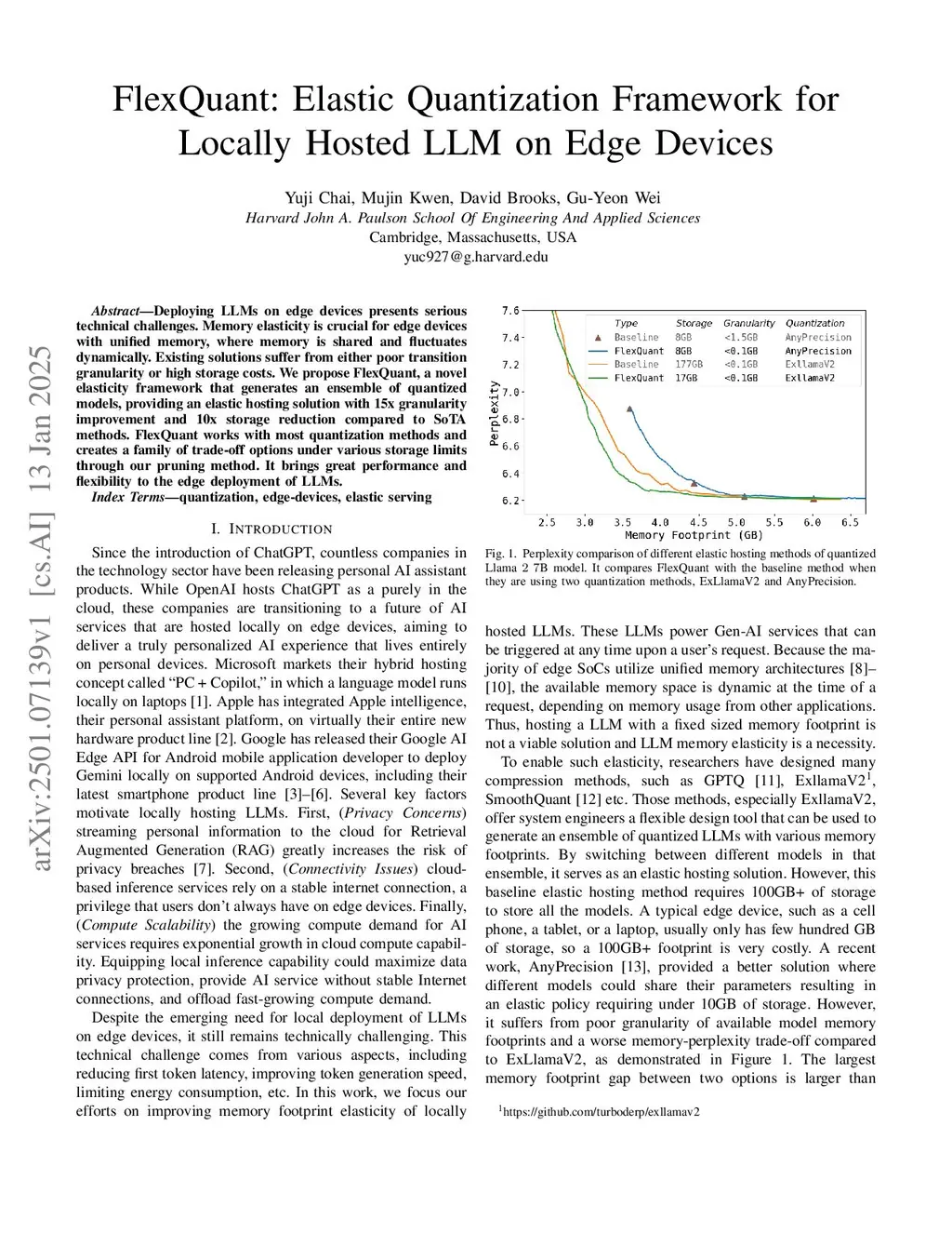Deploying LLMs on edge devices presents serious technical challenges. Memory elasticity is crucial for edge devices with unified memory, where memory is shared and fluctuates dynamically. Existing solutions suffer from either poor transition granularity or high storage costs. We propose FlexQuant, a novel elasticity framework that generates an ensemble of quantized models, providing an elastic hosting solution with 15x granularity improvement and 10x storage reduction compared to SoTA methods. FlexQuant works with most quantization methods and creates a family of trade-off options under various storage limits through our pruning method. It brings great performance and flexibility to the edge deployment of LLMs.